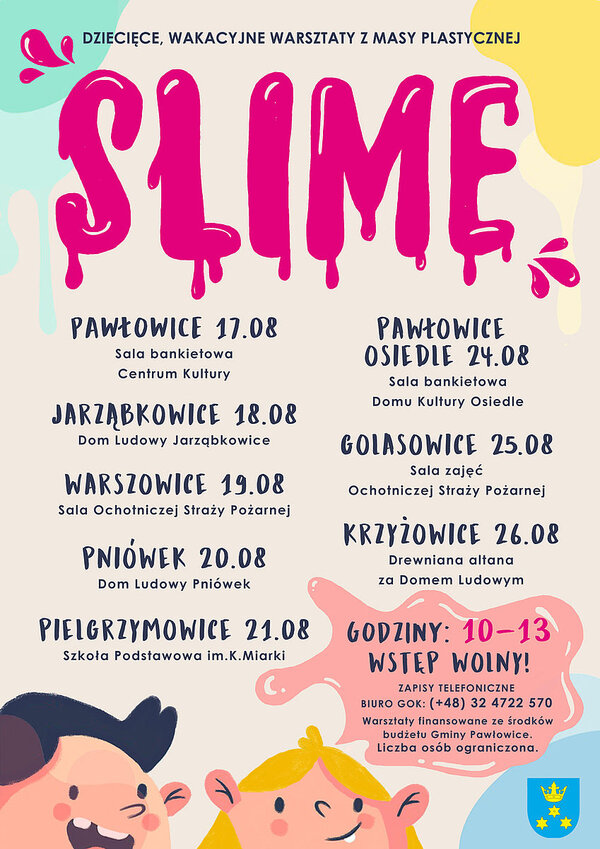 To niejedyna dobra informacja. Od poniedziałku Gminny Ośrodek Kultury rozpoczyna warsztaty dla dzieci z masą plastyczną slime. Warsztaty będą organizowane w poszczególnych sołectwach i są bezpłatne, obowiązuje jednak wcześniejsze zgłoszenie telefoniczne pod numerem: 32/ 47 22 570. Nie we wszystkich sołectwach są jeszcze wolne miejsca, ale na pewno z zajęć można jeszcze skorzystać w Pniówku i Warszowicach.