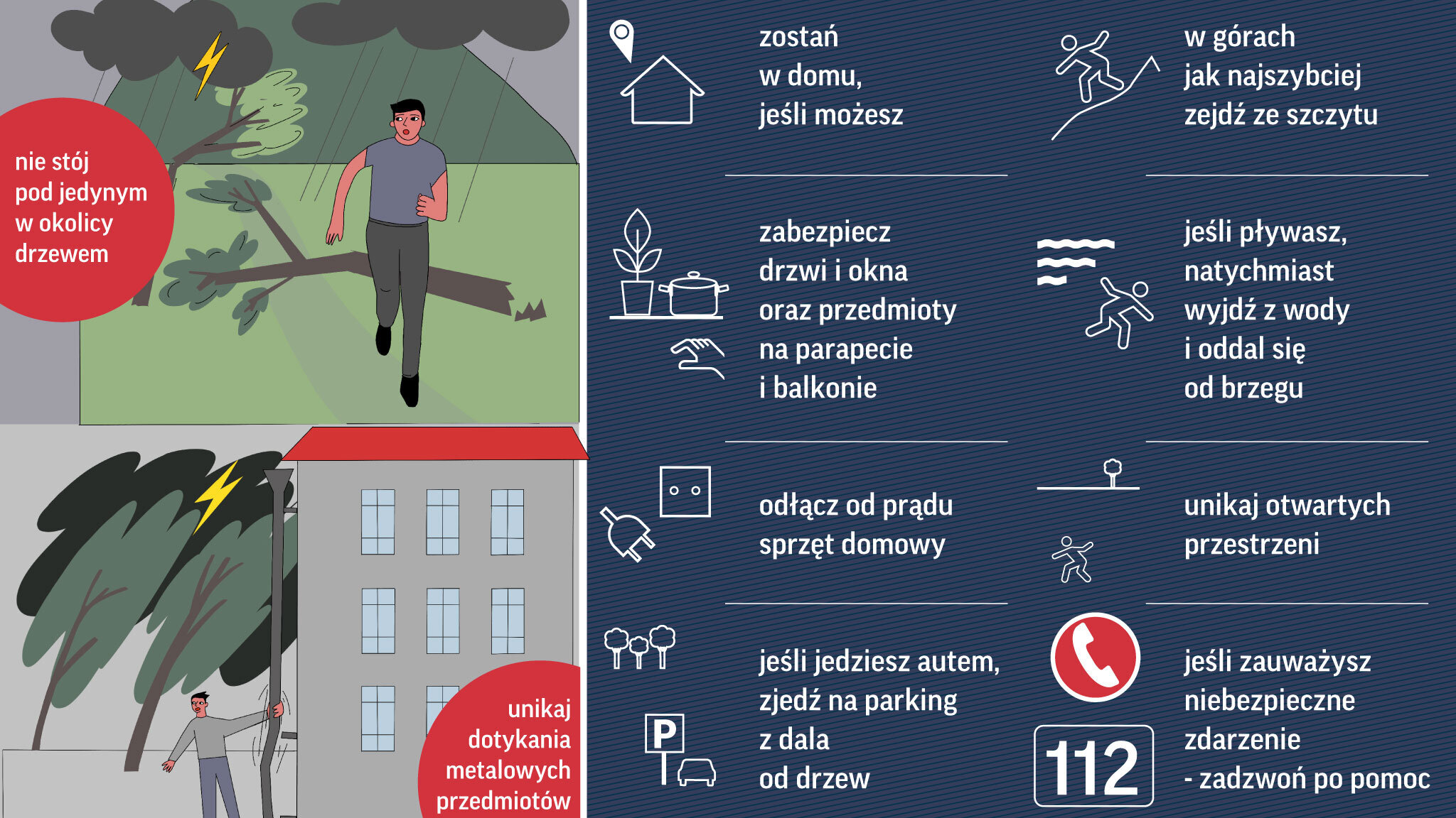 Wakacje to czas, w którym w większym stopniu niż zwykle, narażeni jesteśmy na różnego rodzaju zagrożenia. Szczególnie niebezpieczne są te związane ze zjawiskami atmosferycznymi – m.in. burzami, upałem i wichurami.