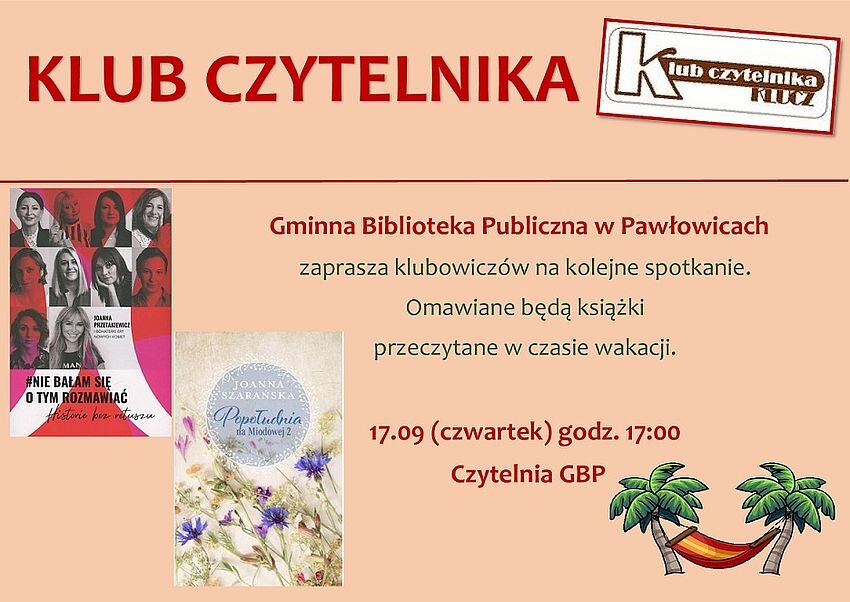 W czasie urlopu przeczytałaś/eś ciekawą książkę i chcesz się nią podzielić z innymi? Serdecznie zapraszamy na spotkanie Klubu Czytelnika, który po dłuższej przerwie wznawia swoją działalność!