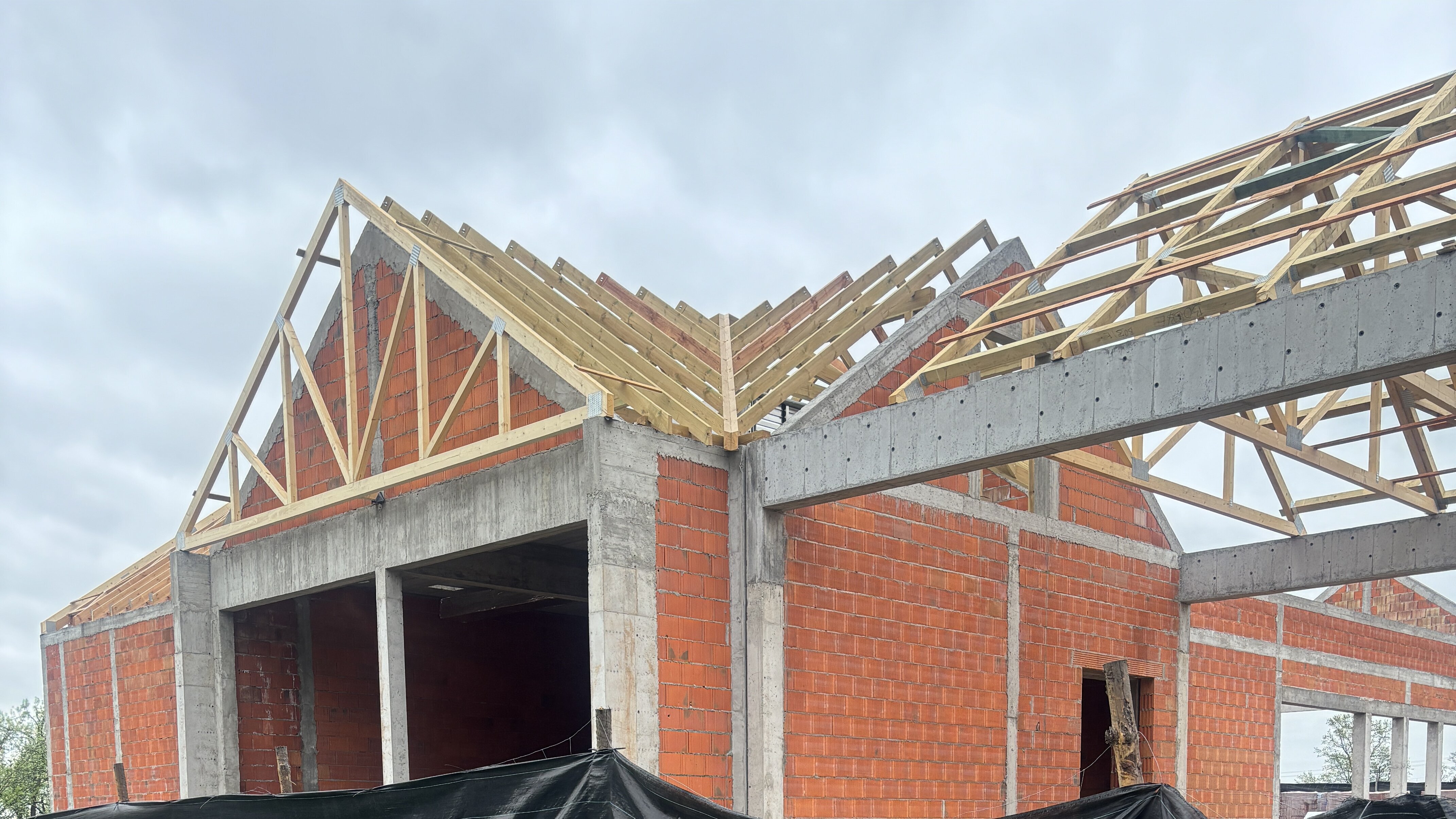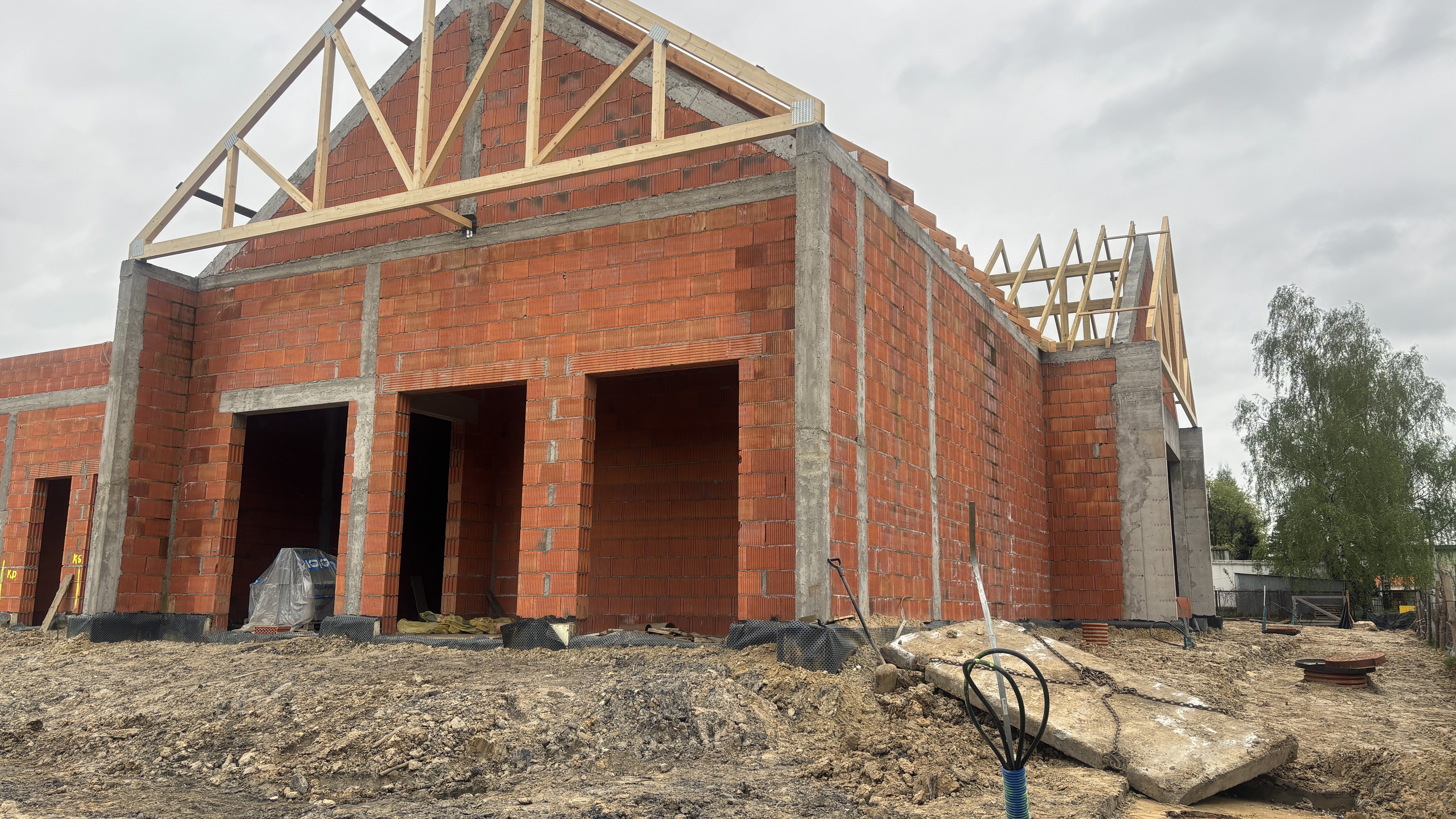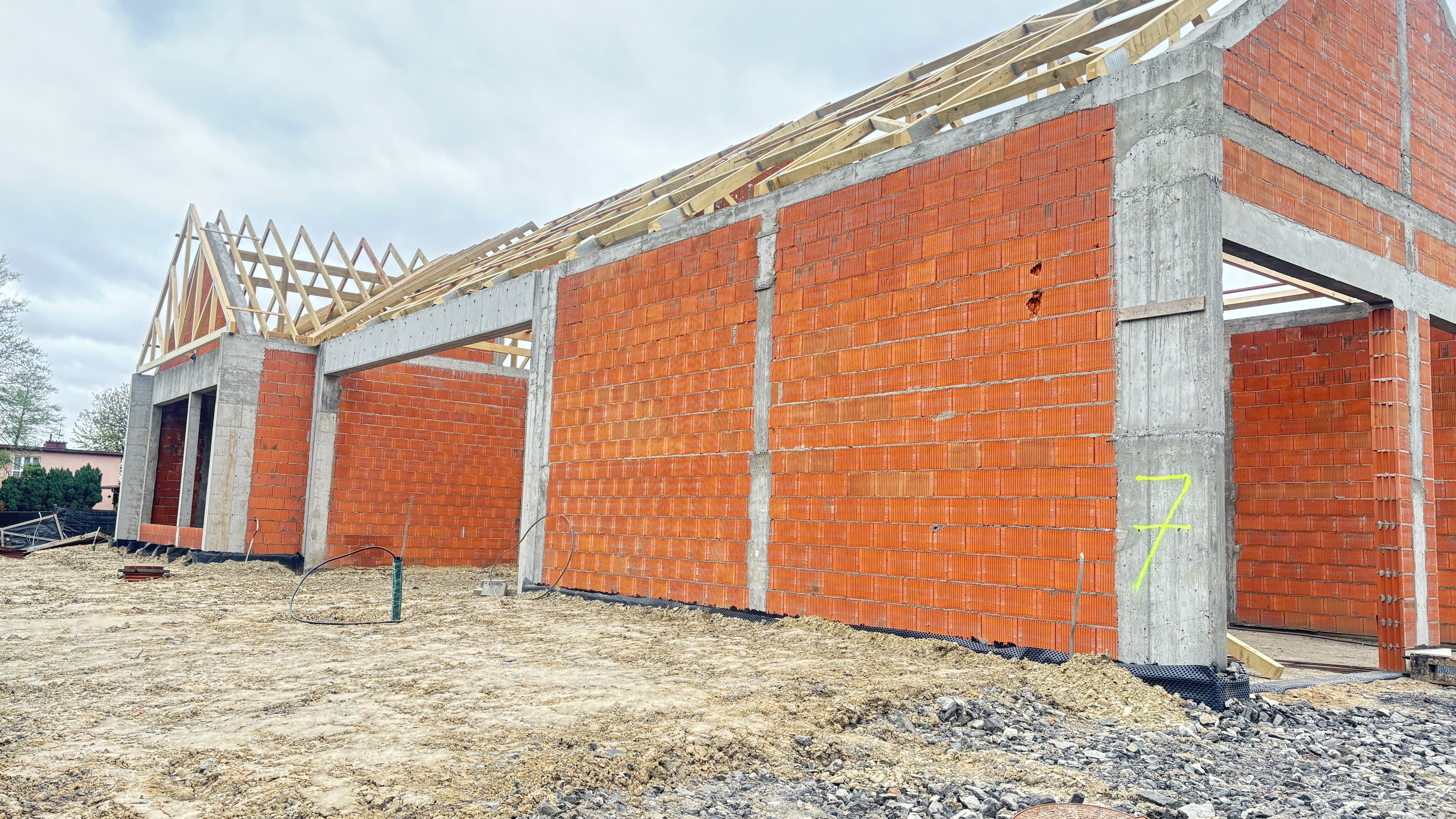 Wykonana została już więźba, a wkrótce zostanie położone pokrycie dachowe. Następnie prace obejmą instalacje wewnętrzne, tynkowanie i zabudowę stolarki aluminiowej.