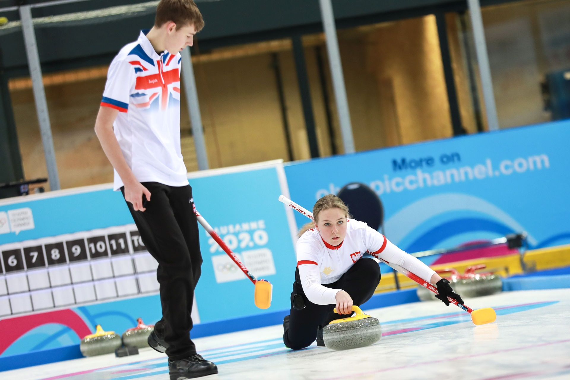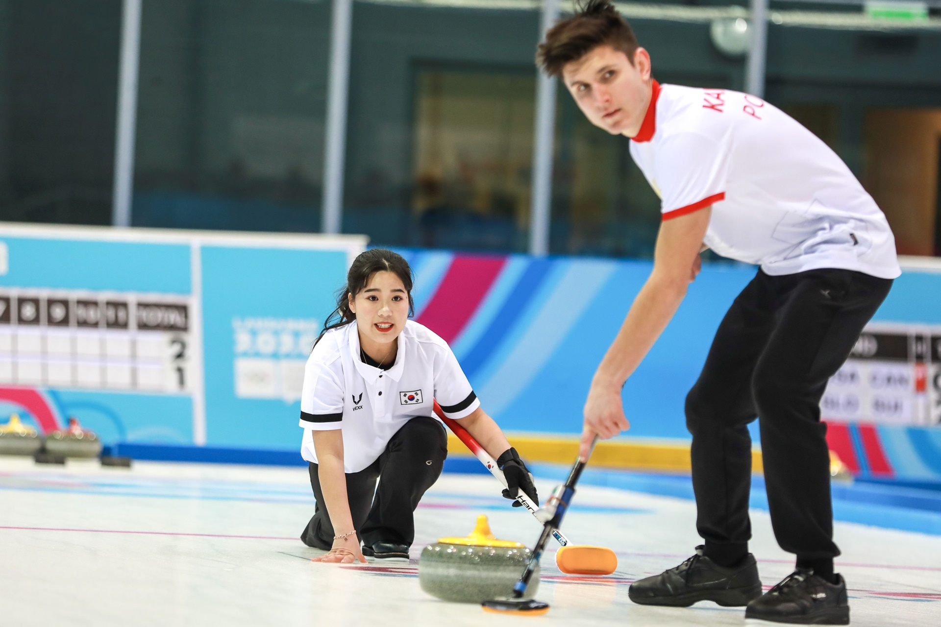 Po zakończeniu części rozgrywek, zawodnicy m.in. biathlonu, hokeja na lodzie trójek, narciarstwa alpejskiego opuścili wioskę olimpijską, a zawodnicy innych dyscyplin zawitali (short track, skoki narciarskie). Przed reprezentacją Polski pozostały jeszcze konkurencje par mieszanych, które rozpoczęły się 18 stycznia. Ta młoda dyscyplina olimpijska na igrzyskach młodzieżowych była zorganizowana w ten sposób, że zawodnicy w zależności od miejsca zajętego w mikstach przydzieleni zostali do swoich kolegów i koleżanek z innych krajów. Na dodatek system rozgrywania par był czysto pucharowy tak więc para przegrywająca żegnała się z turniejem. W pierwszym meczu wszyscy nasi zawodnicy wygrali swoje mecze i tak, Klaudia Szmidt oraz Jamie Rankin z Wielkiej Brytanii wygrali z parą rosyjsko-brazylijską 8:2, Dominik Szmidt z Nillą Hallstroem ze Szwecji wygrali z parą hiszpańsko-niemiecką 10-9, Robert Kamiński z koreańską koleżanką Park Youbeen wygrali z drużyną włosko-amerykańską 8:7, a Monika Wosińska z chińskim kolegą Zhang Likun wygrali z drużyną francusko-nowozelandzką.