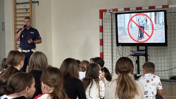 Podczas prelekcji uczniowie dowiedzieli się m.in.: że na hulajnodze elektycznej nie można przewozić innych osób, a po chodnikach można poruszać sie jedynie z prędkością zbliżoną do prędkości pieszego.
