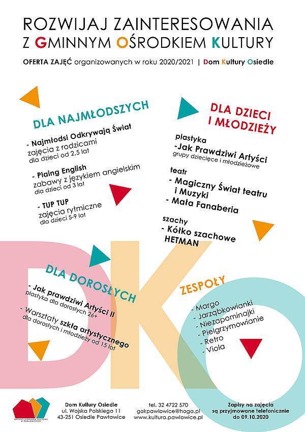 Można już zapisywać się na wszystkie zajęcia prowadzone w obu domach kultury. Z powodu trwającej pandemii musimy zachować wymagane przepisami warunki sanitarne, dlatego na zajęciach i imprezach będzie ograniczona liczba miejsc. O wszystkich zajęciach możecie przeczytać na plakatach. W tym roku mamy nową propozycję dla dzieci - zajęcia rytmiczne!