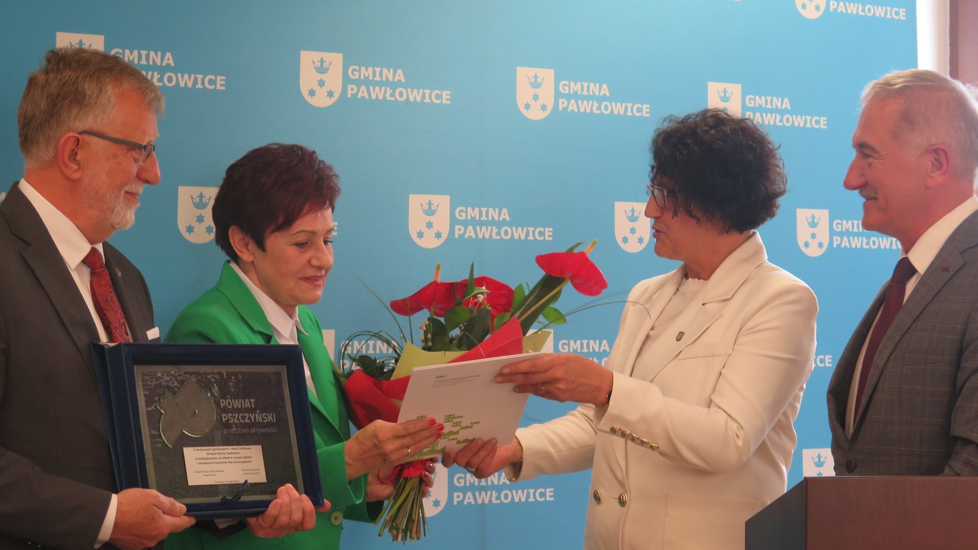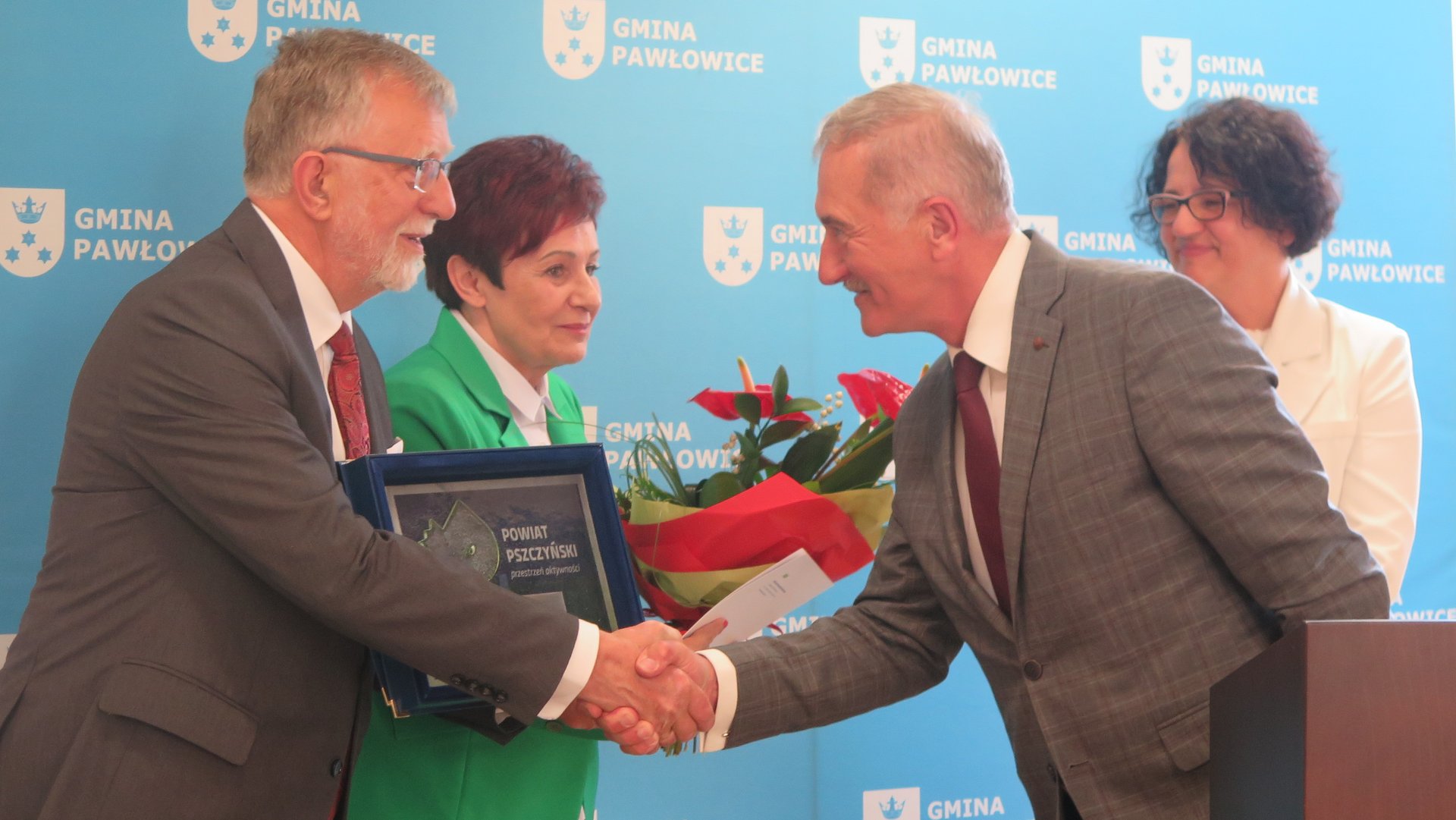 Starosta Barbara Bandoła i członek zarządu Grzegorz Nogły pojawili się 30 maja w sali sesyjnej z życzeniami dla Gminy Pawłowice, która w tym roku świętuje 50 lat swojego istnienia. Z uwagi na wcześniej zaplanowane obowiązki, nie mogli pojawić się na uroczystości, ale w imieniu Rady i Zarządu Powiatu osobiście chcieli pogratulować ostatniego okresu w historii gminy. Na ręce przewodniczącej rady Bogusławy Pietrek i wójta Franciszka Dziendziela złożyli kwiaty i pamiątkowy dyplom, zwracając uwagę na dobrze wykorzystany czas, dzięki któremu gmina pięknieje i się rozwija. Dziękując za współpracę gminy z powiatem, życzyli, aby lokalny samorząd dobrze rozstrzygał i prowadził sprawy mieszkańców.