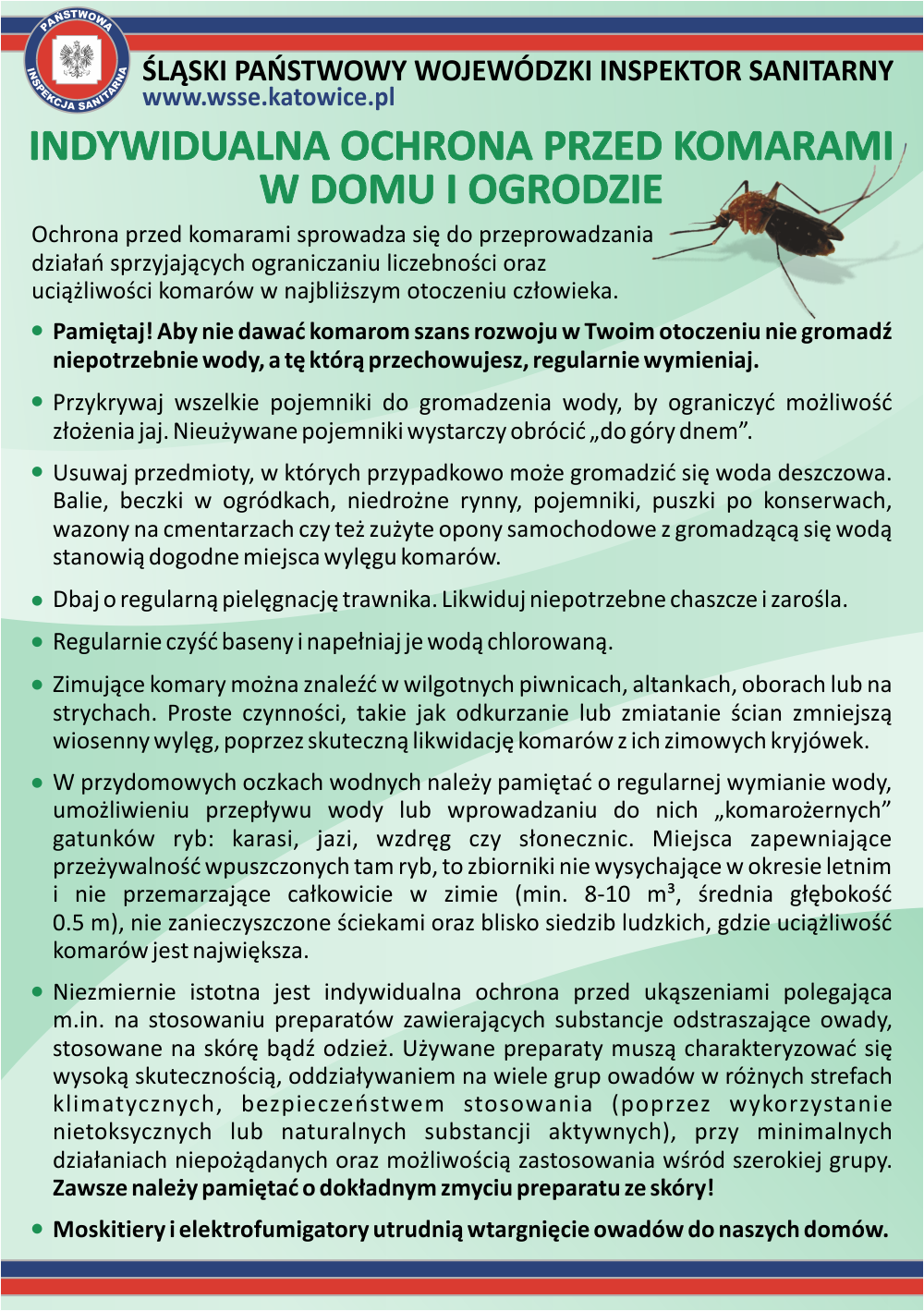 W związku z wystąpieniem dużej ilości komarów na terenie województwa śląskiego przekazujemy Państwu do wiadomości ulotkę na temat sposobów ochrony przed komarami w domu i ogrodzie. Ulotka została opracowana przez Wojewódzką Stację Sanitarno Epidemiologiczną w Katowicach.
