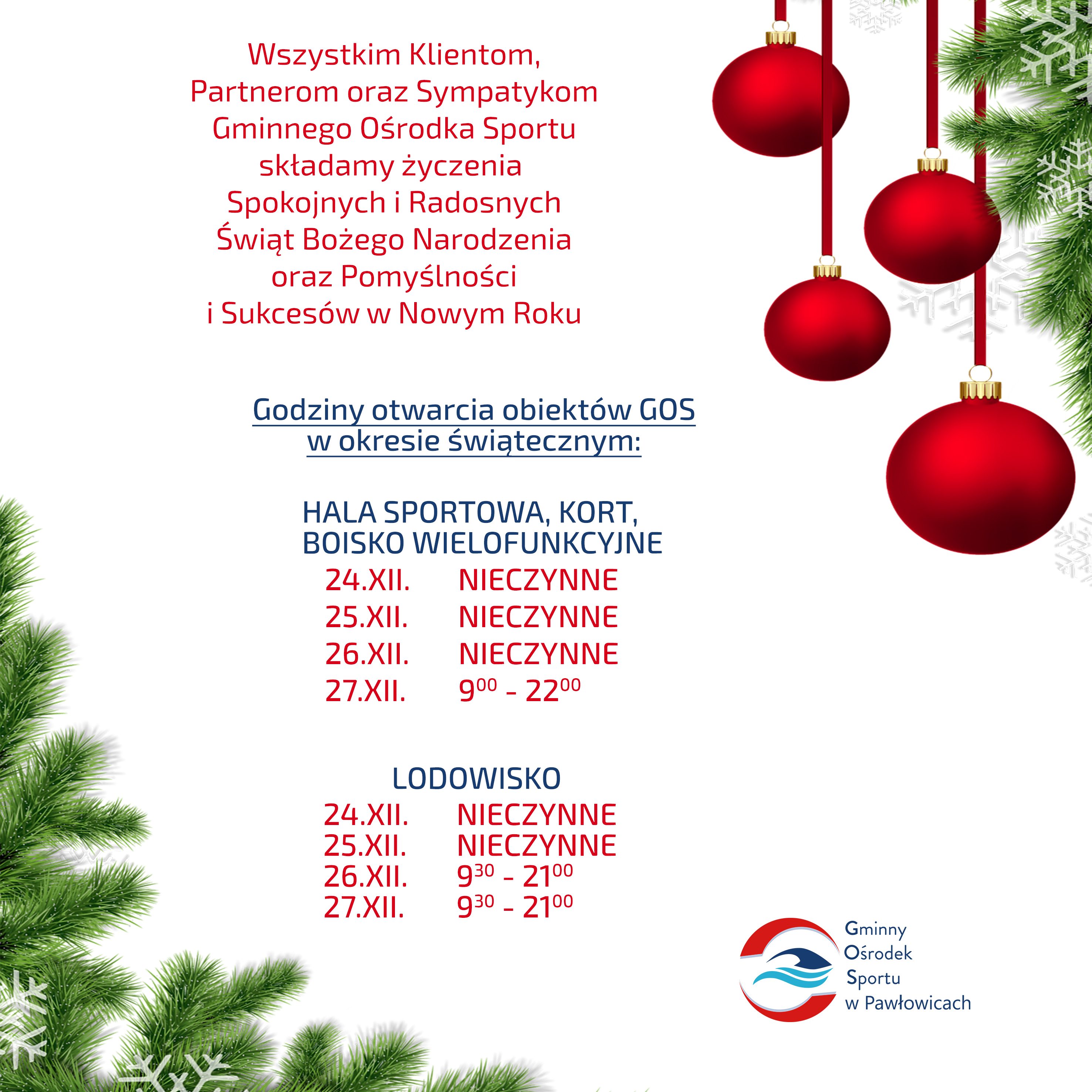 Jednocześnie informujemy, że w związku z obostrzeniami wprowadzonymi najnowszym Rozporządzeniem Rady Ministrów z dnia 21 grudnia 2020r. w sprawie ustanowienia określonych ograniczeń, nakazów i zakazów w związku z wystąpieniem stanu epidemii, od 28 grudnia do 17 stycznia 2021 WSZYSTKIE OBIEKTY należące do Gminnego Ośrodka Sportu są NIECZYNNE.