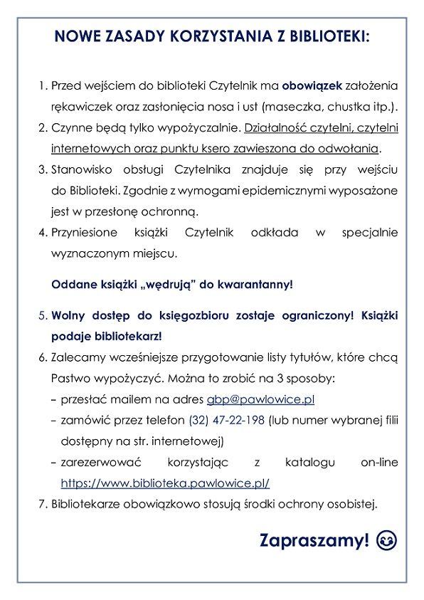 Po kilku tygodniach nieobecności, od 7 maja (czwartek) Gminna Biblioteka Publiczna w Pawłowicach oraz wybrane filie wznawiają działalność.