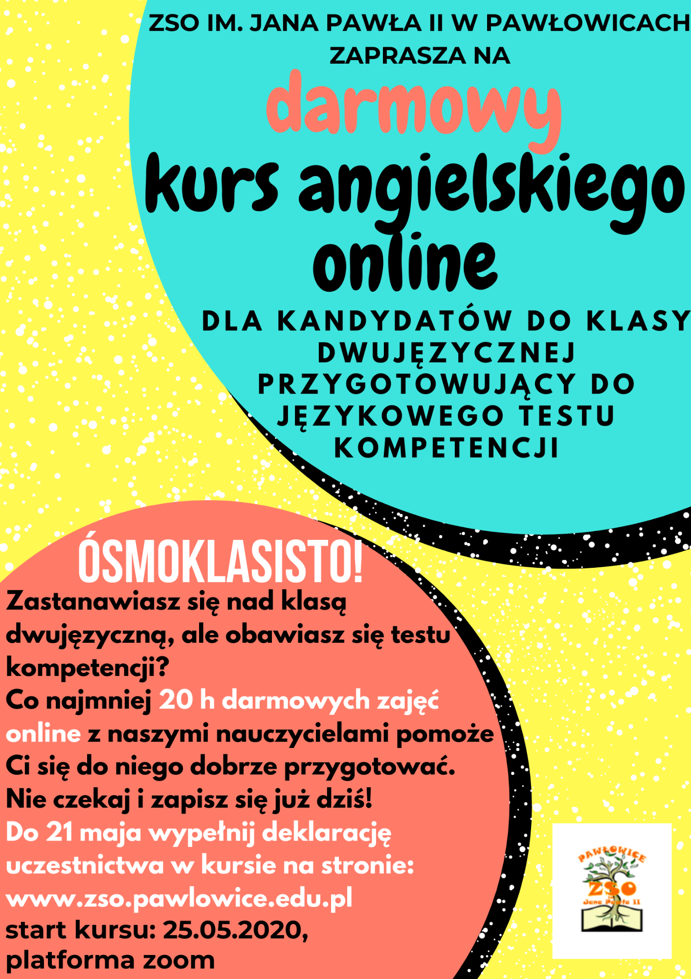 Osoby, które nie złożą deklaracji do 21 maja 2020r. również będą mogły wziąć udział w rekrutacji do oddziału dwujęzycznego w liceum, ale być może ze względów organizacyjnych nie będą mogły wziąć udziału w darmowych lekcjach online, które rozpoczynają się 25 maja na platformie ZOOM. W razie pytań prosimy o kontakt: andrzej.wowra@pawlowice.edu.pl