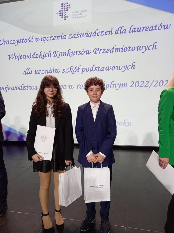 Józefa Piłsudskiego w Warszowicach. Uczennicę do konkursu przygotowała Pani Iwona Cholewa. - Marek Paszenda, laureat z fizyki, uczeń Szkoły Podstawowej nr 2 im. Józefa Pukowca w Zespole Szkolno-Przedszkolnym w Pawłowicach. Ucznia do konkursu przygotowała Pani Joanna Gryboś.