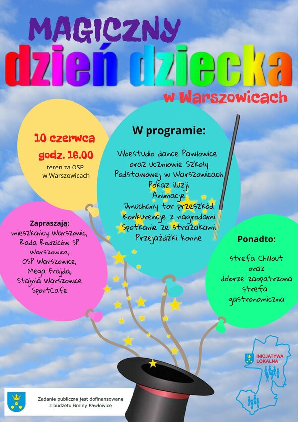 10 czerwca o godz. 16:00 na terenach za OSP w Warszowicach w ramach inicjatywy lokalnej odbędzie się dzień dziecka. W programie przewidziany jest występ Vibestudio dance Pawłowice oraz uczniów Szkoły Podstawowej w Warszowicach. Ponadto organizatorzy zaplanowali pokazy iluzji, animacje, dmuchany tor przeszkód, spotkanie ze strażakami, przejażdżki konne oraz konkurencje z nagrodami. Ponadto w strefie gastronomicznej będzie można zjeść m.in. ciepły posiłek, natomiast chwili relaksu zaznamy w strefie chillout.Na wydarzenie zapraszają: mieszkańcy Warszowic, Rada rodziców Szkoły Podstawowej w Warszowicach, Ochotnicza Straż Pożarna, Mega Frajda, Stajnia Warszowice oraz SportCafe. Zadanie publiczne jest dofinansowane z budżetu Gminy Pawłowice.