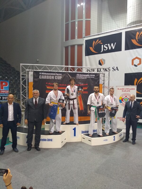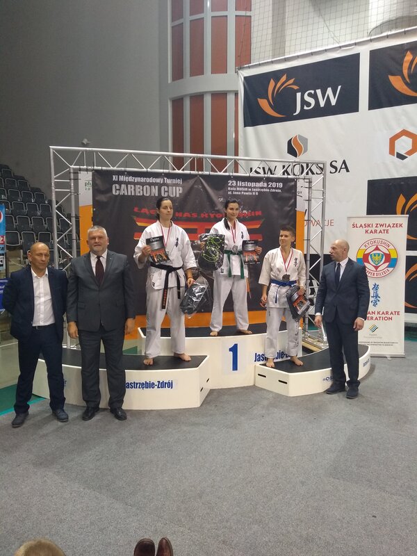 W dniu 23 listopada 2019 r. w Jastrzębiu-Zdroju w Międzynarodowym Turnieju Karate Kyokushin Carbon Cup udział wzięło 330 zawodników. Nasz Klub reprezentowała Katarzyna Hałat, która w spektakularny sposób pokonała utytułowaną zawodniczkę, tegoroczną zdobywczynię medalu na Grand Prix Karate Kyokushin w Tokio. Jej wysiłek zaowocował zdobyciem złotego medalu w kategorii Kumite Seniorek. Kolejny nasz reprezentant Krzysztof Wyrwich zdobył brązowy medal w kategorii Kumite Senior. Serdecznie gratulujemy zawodnikom i życzymy dalszych sukcesów sportowych.fot. Pawłowicki Klub Karate Kyokushin