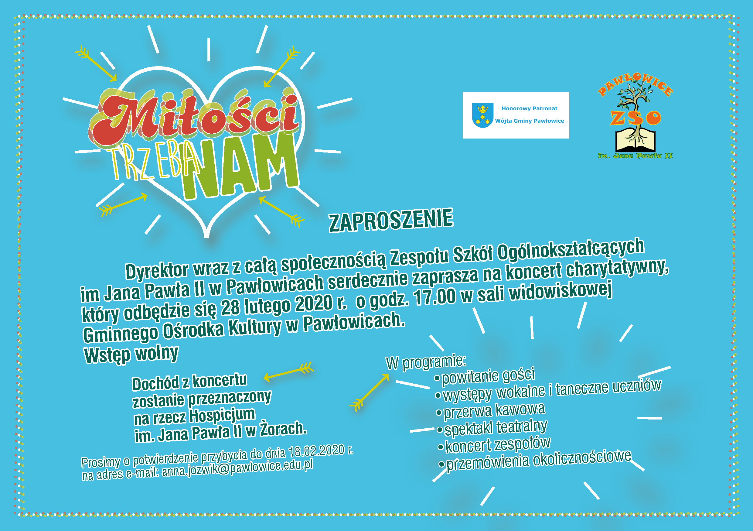 Już dziś serdecznie zapraszamy na koncert charytatywny organizowany przez Zespół Szkół Ogólnokształcących im. Jana Pawła II w Pawłowicach. Wydarzeniu przyświeca szczytny cel - wsparcie hospicjum w Żorach. Na scenie wystąpią uczniowie oraz absolwenci szkoły (i nie tylko). Oprócz zaprezentowania swoich umiejętności wokalnych i tanecznych, artyści w nietuzinkowy sposób przedstawią poezję Gałczyńskiego.