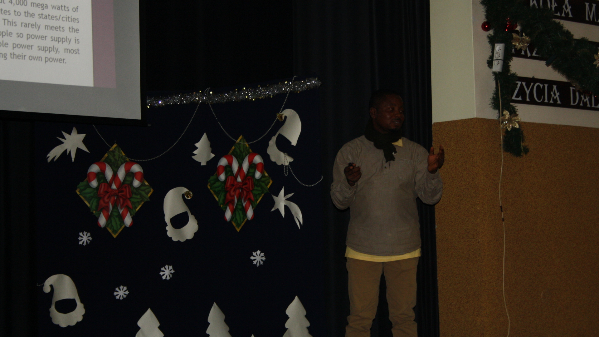 Po zakończeniu swojego udziału w konferencji przyjął zaproszenie do szkoły w Pielgrzymowicach i zaprezentował uczniom klas V-III Gimnazjum swój kraj, kulturę – podstawy wiedzy. Chętnie pozował do zdjęć, odpowiadał na wszystkie pytania. Odwiedził także uczniów najmłodszych klas. Dla wielu uczniów była to jedyna okazja do poznania mieszkańca Afryki oraz do usłyszenia wielu nieznanych informacji o ludziach ich problemach, codziennym życiu. Nie krył on swoich zachwytów szkołą, jej uczniami i nauczycielami. Na koniec zapewniał, że w przyszłym roku musi odwiedzić Polskę na dłużej.