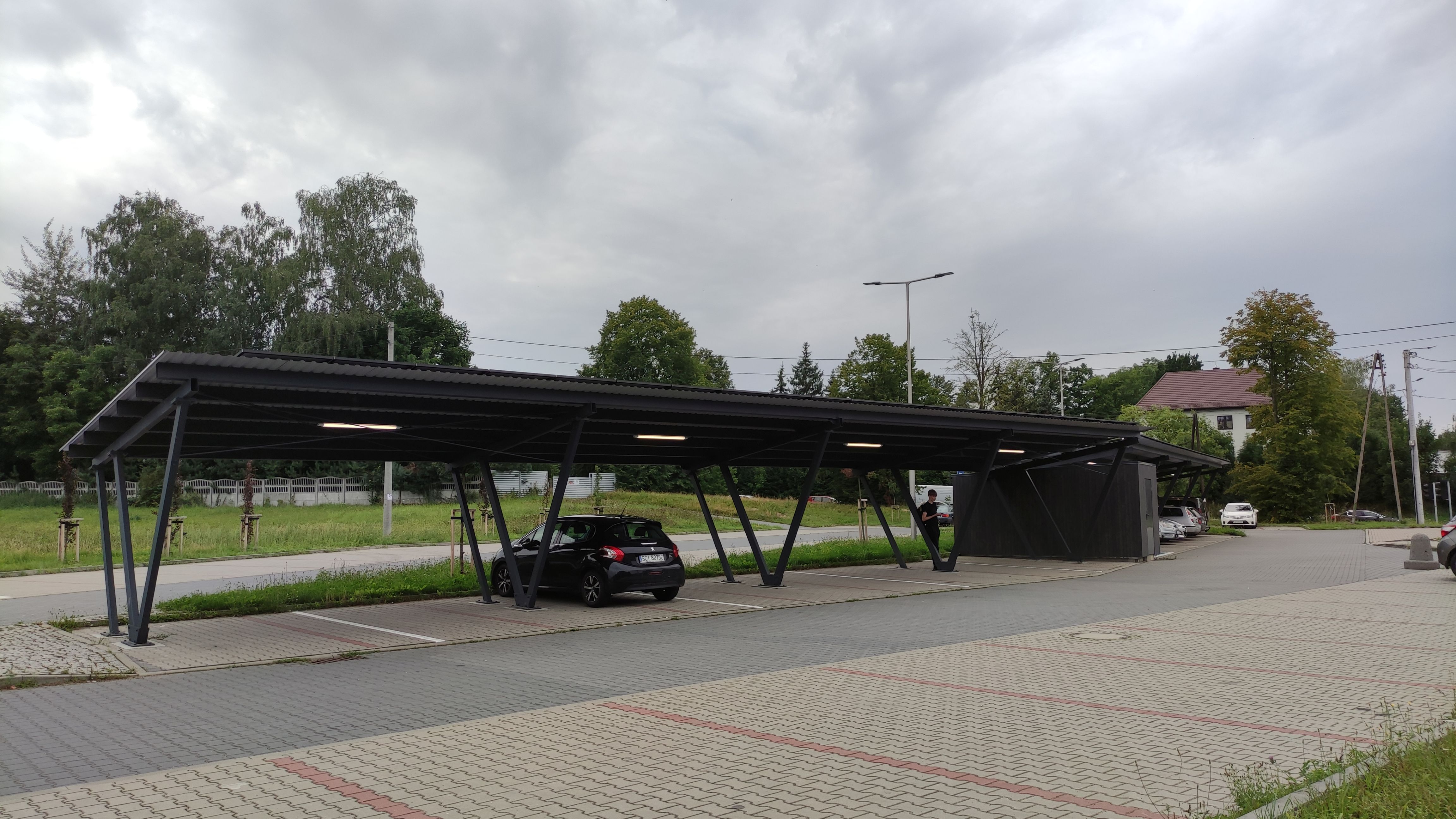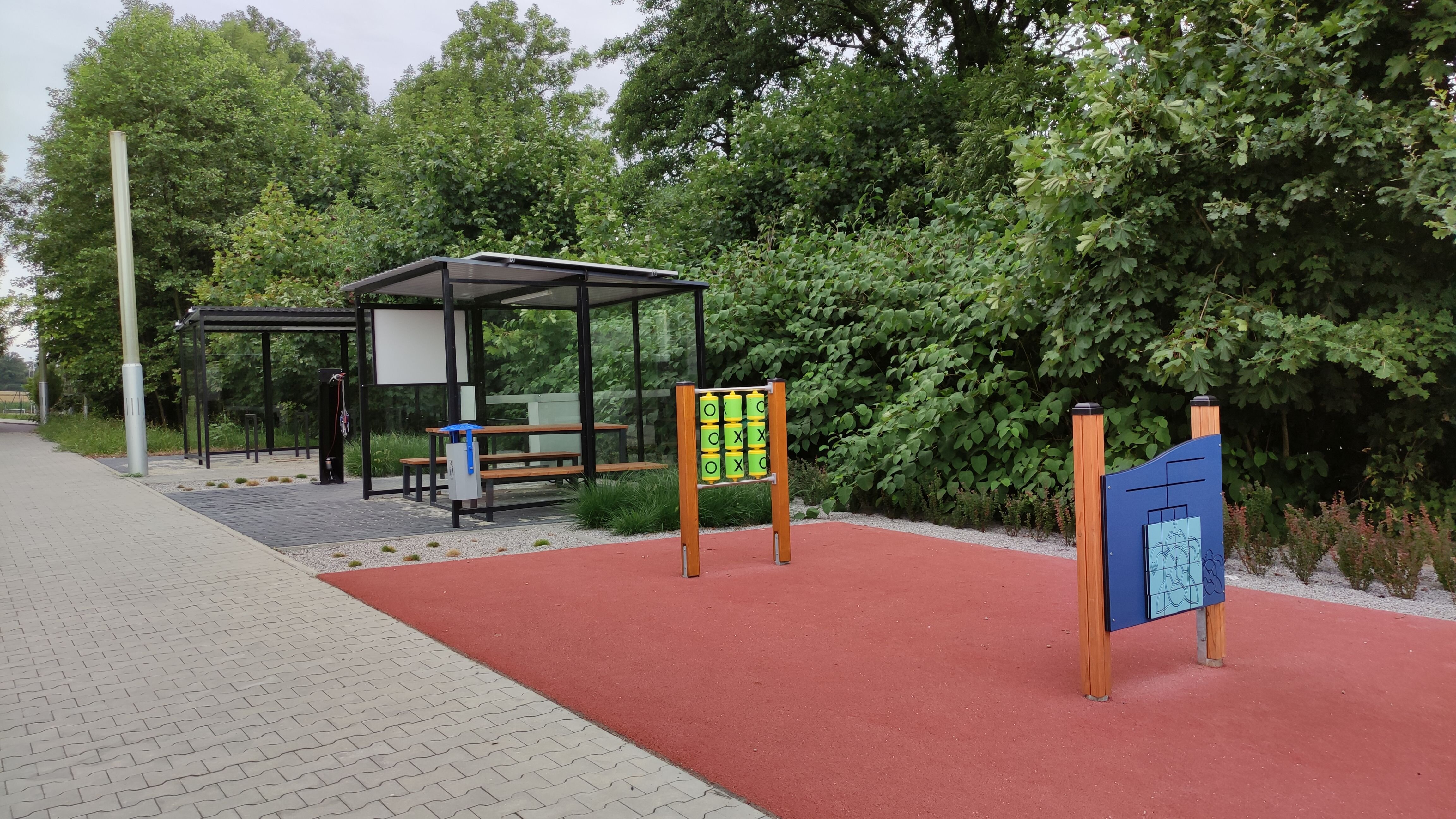 (zadaszony parking na samochody osobowe: 16 miejsc parkingowych, zadaszona wiata rowerowa, zadaszona wiata rekreacyjna, toaleta publiczna, samoobsługowa stacja naprawy rowerów, urządzenie edukacyjno-zabawowe)