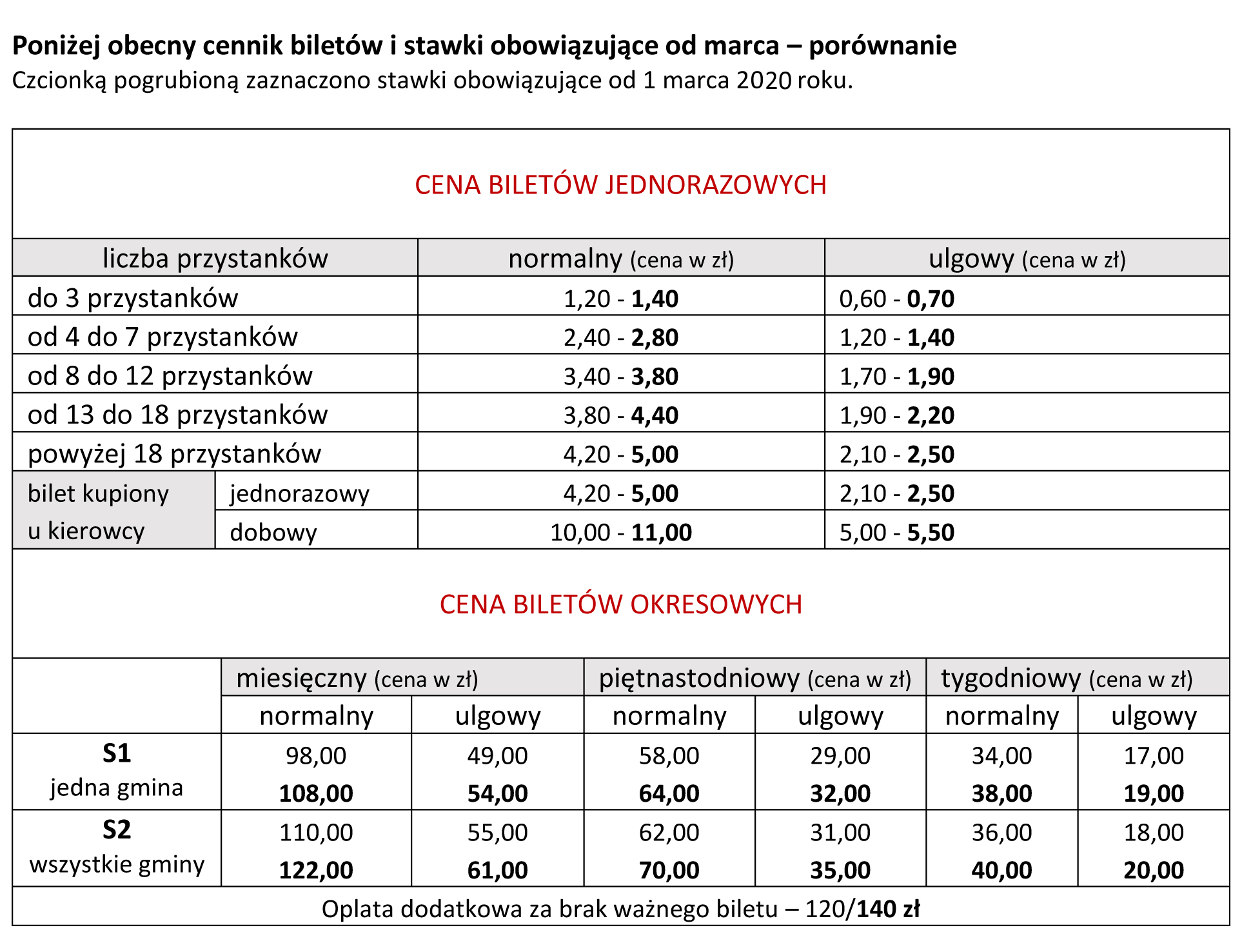 Zanim Zarząd Związku podjął decyzję o wzroście cen, zielone światło do takich działań dali przedstawiciele wszystkich dziesięciu gmin tworzących MZK. Przewidywany wzrost cen biletów, w wysokości 20% obecnej ceny, wpisano wcześniej do planu tegorocznego budżetu. Ostatecznie podwyżka nie będzie tak dotkliwa. Zarząd MZK przez kilka tygodni analizował szereg wariantów. Ostatecznie zmiany zróżnicowano w zależności od rodzaju biletu. Średni wzrost cen biletów jednorazowych wyniesie ok. 15%. Najniższy dotyczy biletu dobowego kupowanego u kierowcy, którego cena wzrośnie o 10%, z 10 do 11 zł. Największy skok zanotujemy kupując bilet na najdłuższych trasach (powyżej 18 przystanków). Jego cena wzrośnie z 4,20 zł do 5 zł (wzrost o 19%). Średni wzrost biletów okresowych (miesięcznych, piętnastodniowych i tygodniowych) to ok. 11%. O 20 zł wzrośnie także opłata dodatkowa, tzw. mandat za jazdę bez ważnego biletu. Od marca gapowicze zapłacą 140 zł.