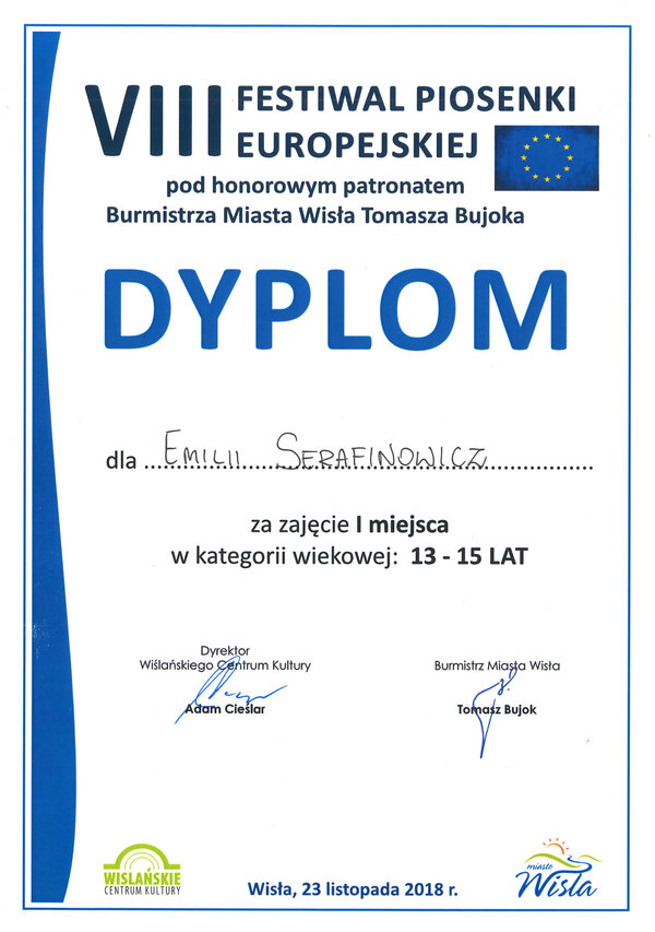 Emilia Serafinowicz z grupy musicalowej „eM” zajęła pierwsze miejsce w VIII Festiwalu Piosenki Europejskiej w Wiśle! Był to jej debiut w tym wojewódzkim konkursie. Emilka śpiewała w kategorii wiekowej 13-15, mając 12 lat. :) Konkurencja była duża – ponad dwadzieścia osób w tej kategorii wiekowej – i świetnie przygotowana. Jednak utwory „Sign of the Times” oraz „Och życie, kocham cię nad życie” podbiły serca jury. Serdecznie gratulujemy!