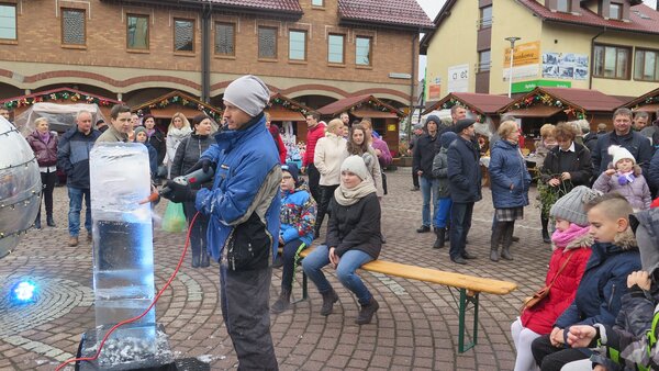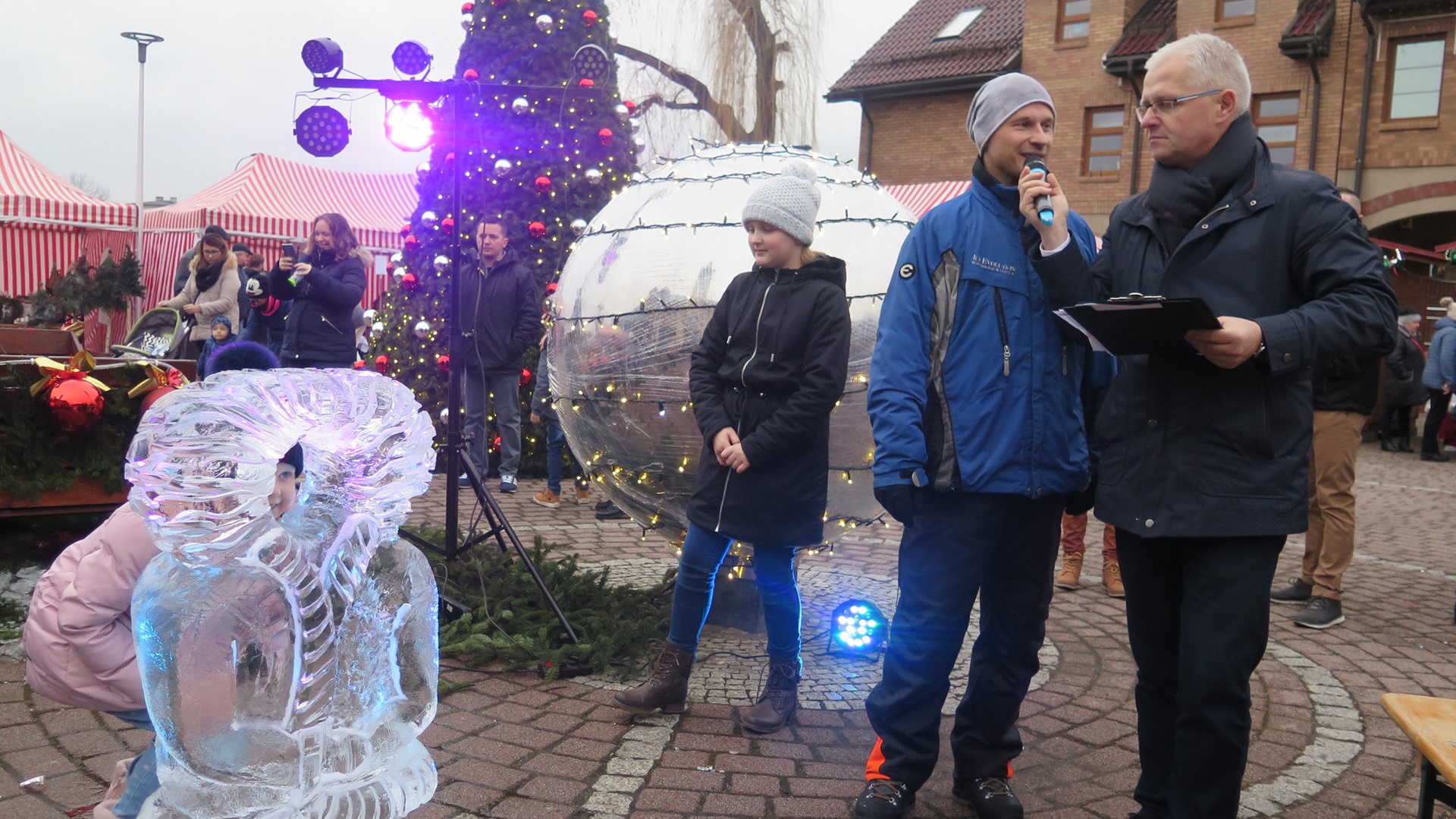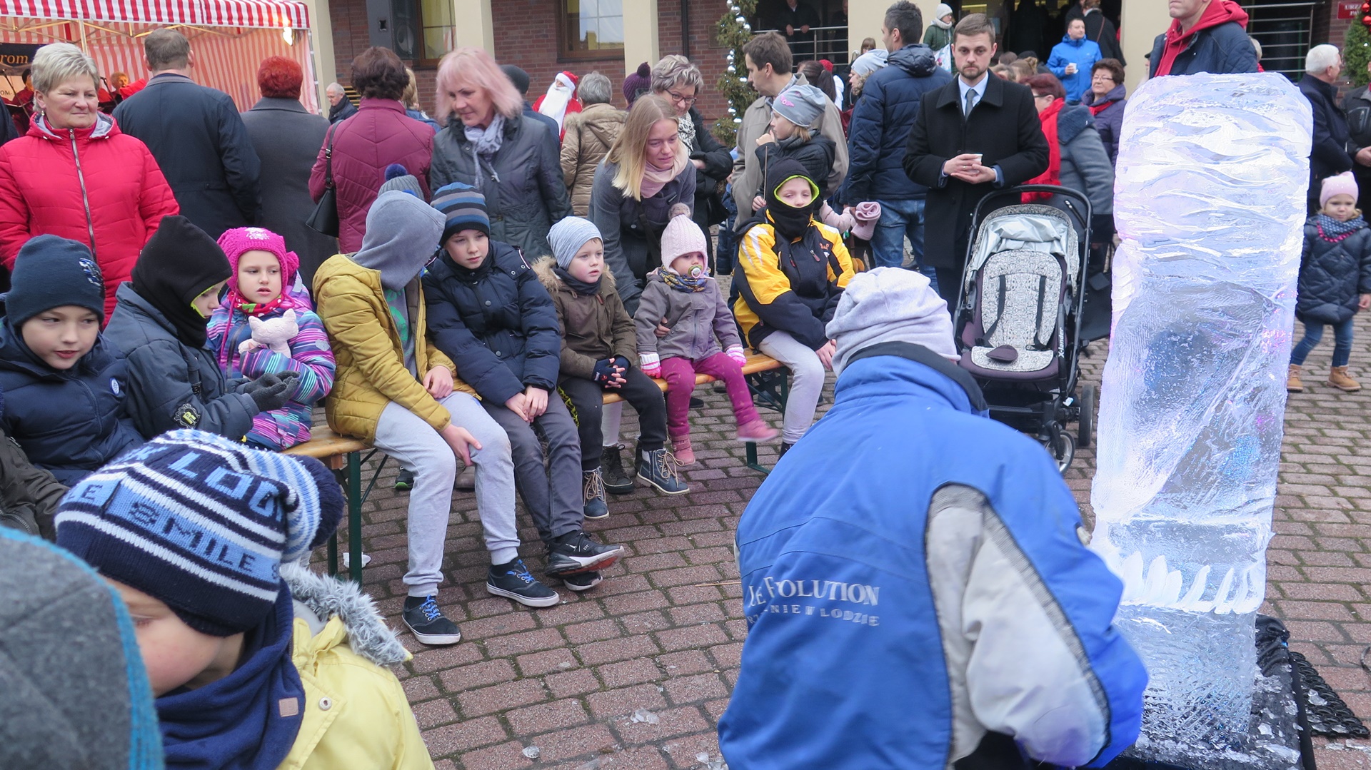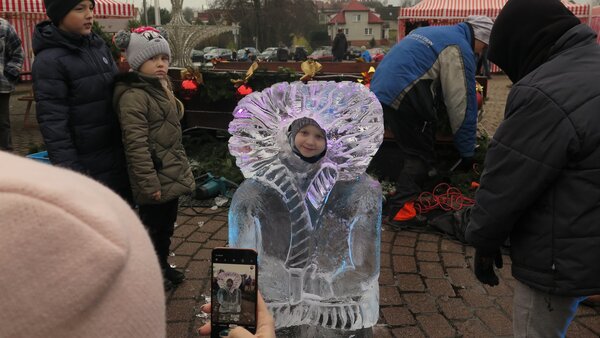 Śniegu wprawdzie nie było, ale za to był lód. Cała bryła lodu, z której pod wprawną ręką Rafała Stawowego z Ice Evolution powstała rzeźba Eskimosa. Dodajmy - Eskimosa bez twarzy, aby każdy chętny mógł lodowej postaci użyczyć swojej i jeszcze wykonać pamiątkowe zdjęcie. Podglądanie jak powstaje rzeźba z lodu okazało się interesujące zarówno dla dorosłych jak i dzieci.