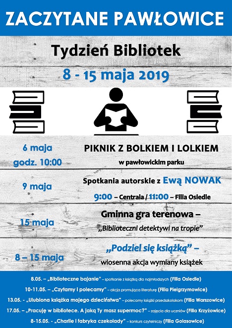 Blisko 150 przedszkolaków z gminy Pawłowice, ozdobionych emblematami z Bolkiem i Lolkiem przywędrowało na plac przy urzędzie gminy w związku z udziałem w pikniku bibliotecznym. Dzieci spotkały się z zastępczynią wójta Joanną Śmieją i zaśpiewały piosenkę o wiośnie. Na pamiątkę otrzymały odblaskowe misie. Wprawdzie pogoda nie zachęcała do zabaw na świeżym powietrzu, ale przedszkolaki znalazły miejsce w Centrum Kultury. Piknik był zapowiedzią akcji koordynowanej przez Gminną Bibliotekę Publiczną w Pawłowicach, która w ramach Tygodnia Bibliotek przygotowała jeszcze inne atrakcje. 9 maja odbędą się dwa spotkania autorskie z Ewą Nowak - powieściopisarką dla dzieci i młodzieży, 15 maja - gra terenowa "Biblioteczni detektywi na tropie", a przez cały tydzień, od 8 do 15 maja - wiosenna wymiana książek "Podziel się książką". Atrakcje przygotowały również filie biblioteki w poszczególnych sołectwach. Szczegóły na plakacie.