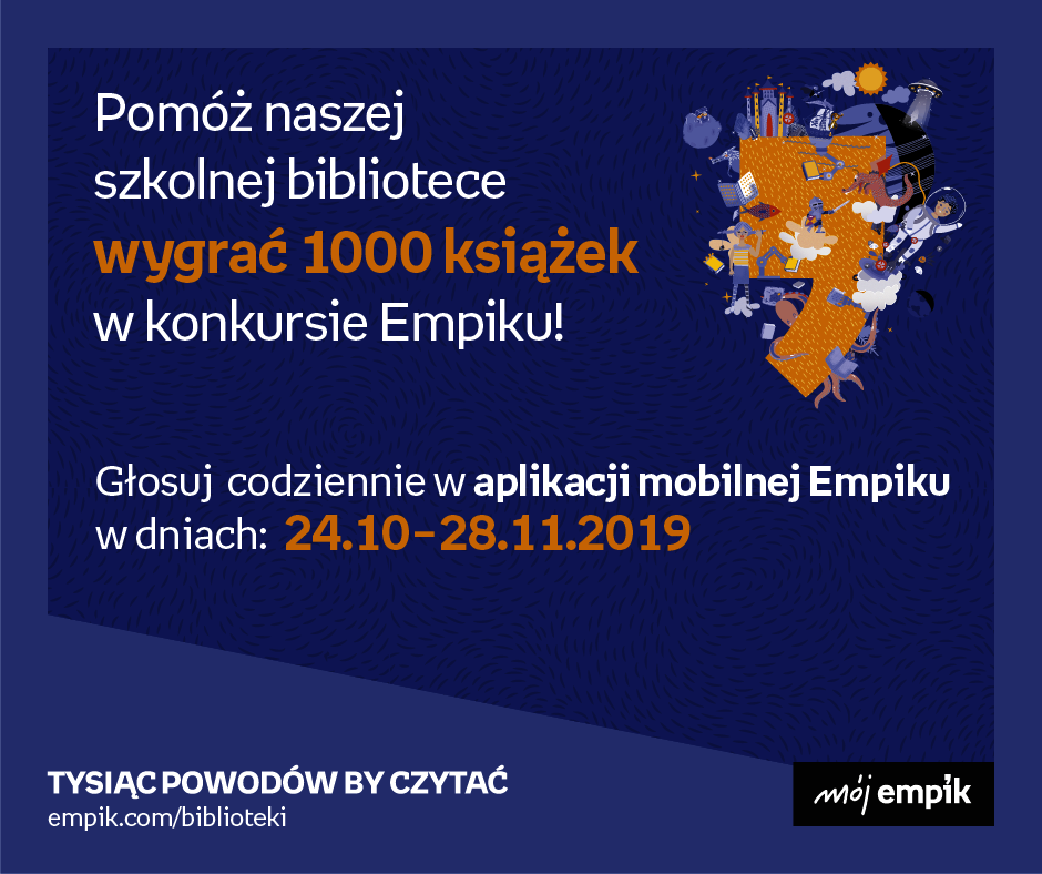 Od 24.10 do 28.11 w aplikacji mobilnej Empik można oddawać głosy na naszą szkołę. Głosować mogą wszyscy, i to codziennie: rodzice i krewni uczniów, znajomi, lokalne społeczności oraz miłośnicy książek.