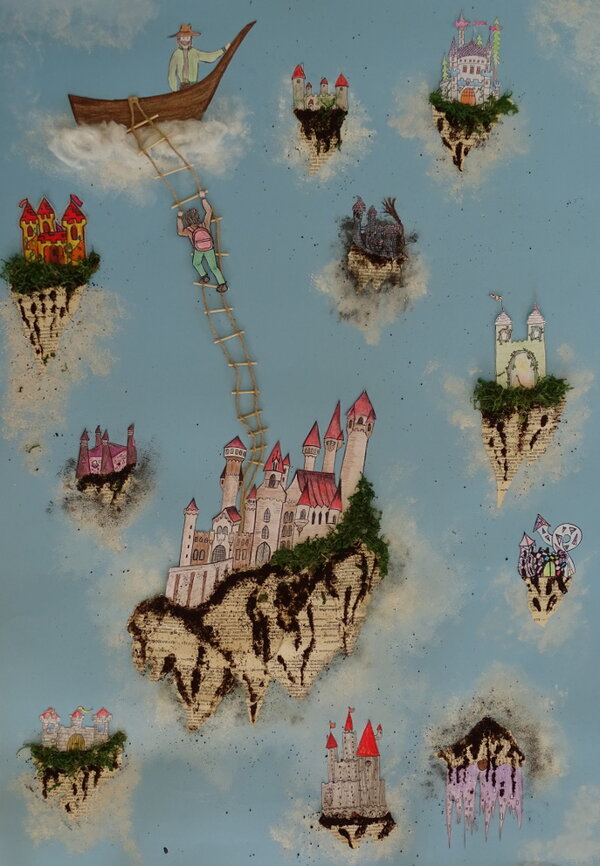 W ostatnim tygodniu uczniowie z zapałem i ogromnym zaangażowaniem tworzyli w bibliotece plakat przedstawiający scenę z książki „Pięć królestw. Łupieżcy niebios” autorstwa Brandona Mulla. To pozycja obowiązkowa dla wszystkich fanów fantastyki. Wyobraźnia młodych twórców, ich talent i pasja powołały do życia piękną ilustrację – przedstawiającą wielką, błękitną przestrzeń, po której pływają różnorodne tajemnicze zamki.
