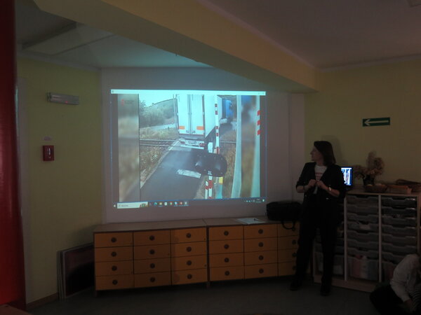 Korzystając z filmów z kamer monitorujących przejazdy kolejowe przedstawiono uczniom realne sytuacje, które mogą prowadzić do poważnych wypadków. Młodzież dowiedziała się również, że w ostatnim czasie zmieniono konstrukcję rogatek, tak, aby z łatwością można było je zdemontować w przypadku utknięcia na zamkniętym przejeździe kolejowym (pod wpływem nacisku odblokowane zostają zaczepy szlabanu, który automatycznie wypada i udrażnia wyjazd). Jednym z istotnych elementów zajęć było również omówienie narzędzi i środków, które posiadają pracownicy Straży Ochrony Kolei w walce z wandalami oraz chuliganami.