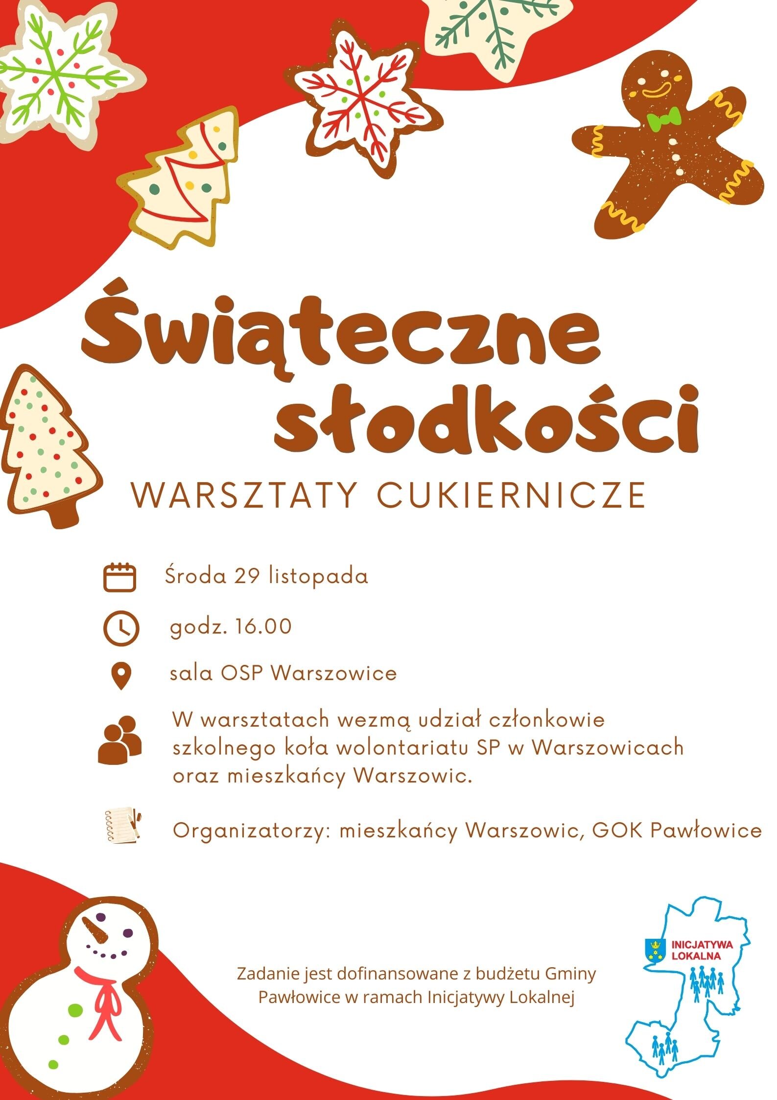 W środę 29 listopada 2023 r. o godz. 16:00 w sali Ochotniczej Straży Pożarnej w Warszowicach odbędą się warsztaty cukiernicze, podczas których uczestnicy będą mieli możliwość upiec świąteczne ciasteczka. Organizatorami warsztatów są mieszkańcy Warszowic oraz Gminny Ośrodek Kultury w Pawłowicach. Zadanie jest dofinansowane z budżetu Gminy Pawłowice