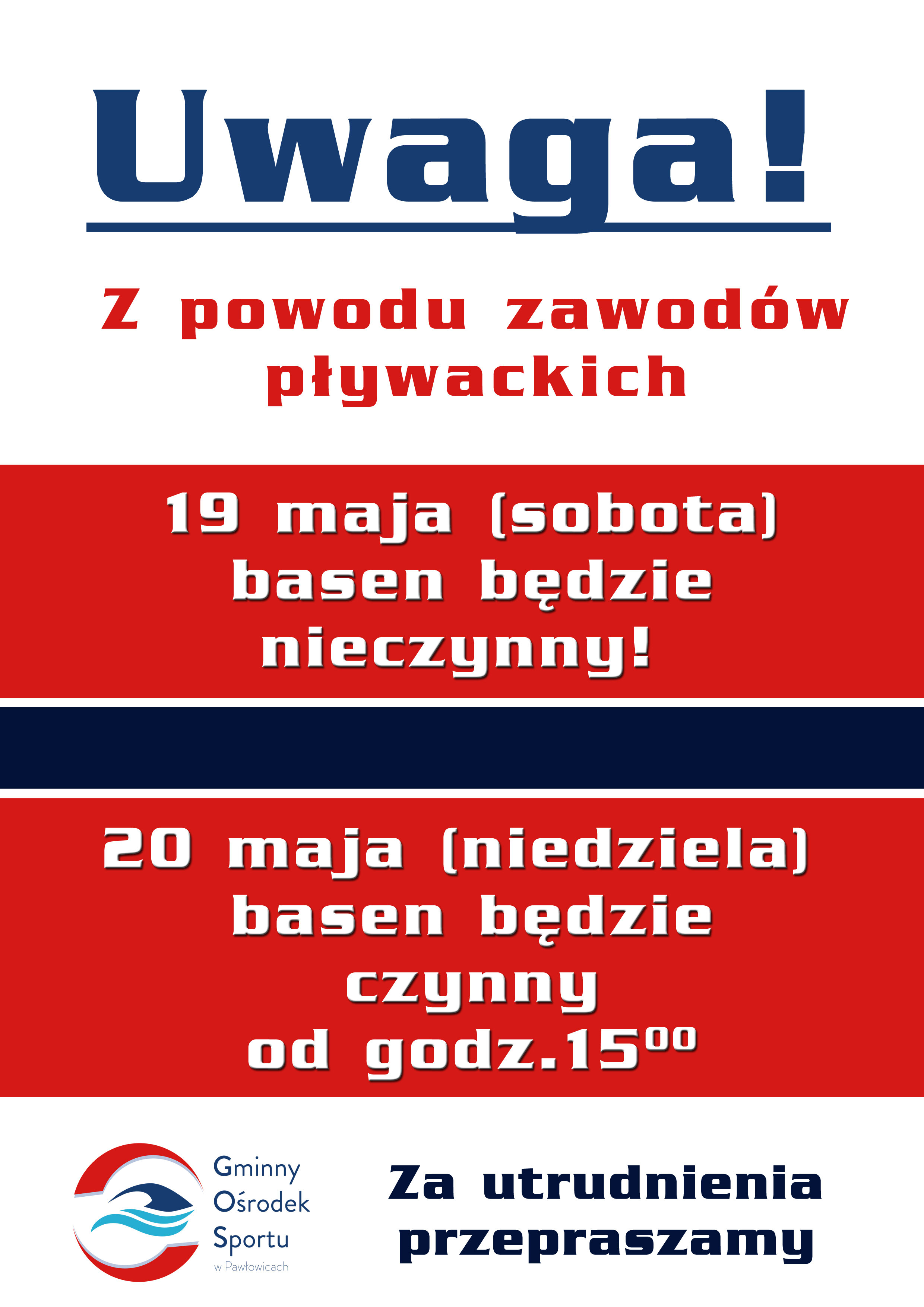 Gminny Ośrodek Sportu informuje, że w związku z organizacją IX Międzynarodowego Mitingu Pływackiego w sobotę 19 maja basen będzie nieczynny, natomiast w niedzielę 20 maja będzie czynny od godziny 1500.Za utrudnienia przepraszamy.