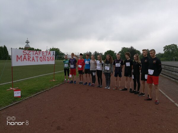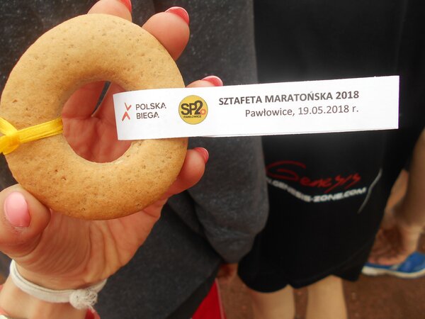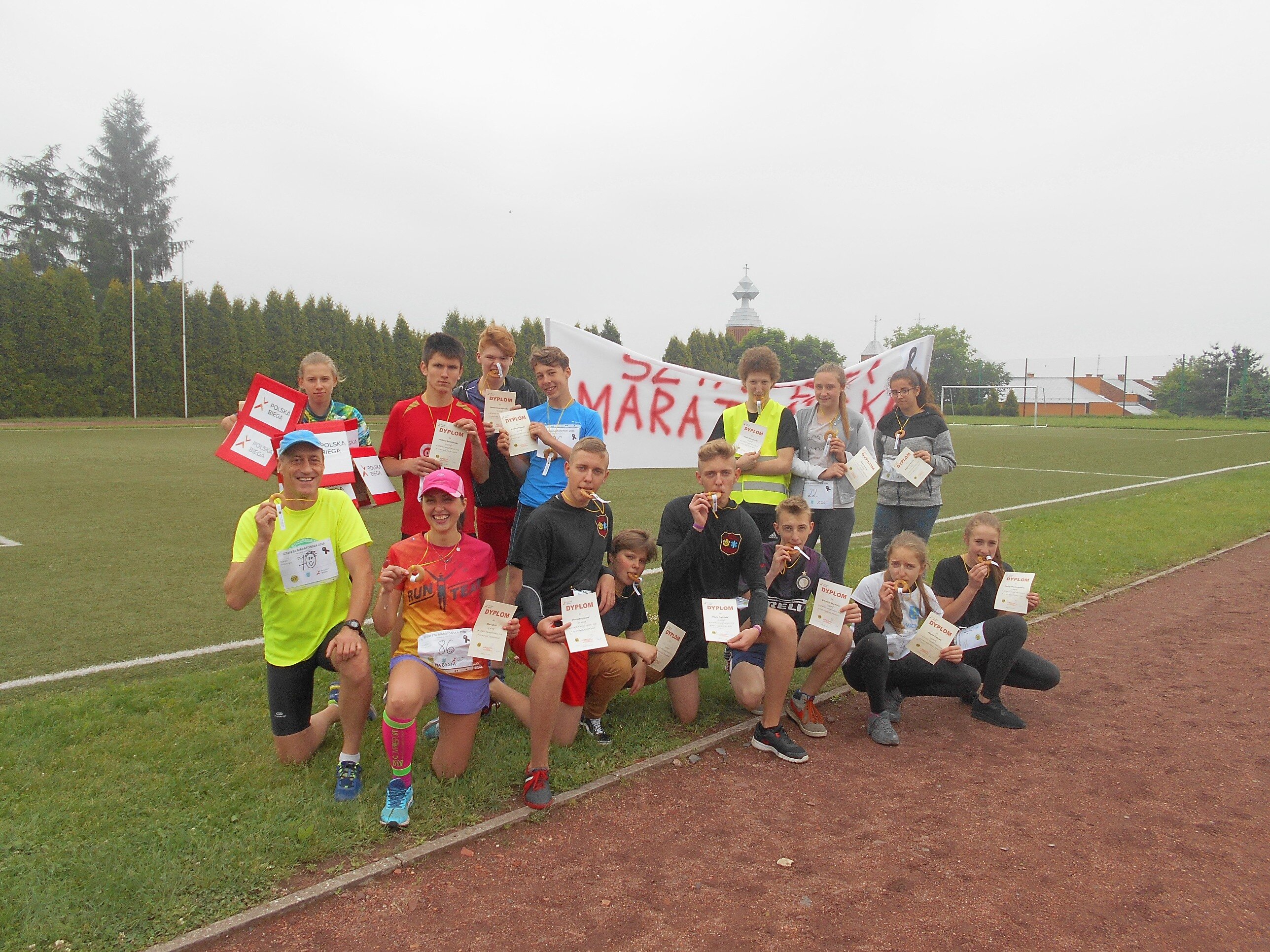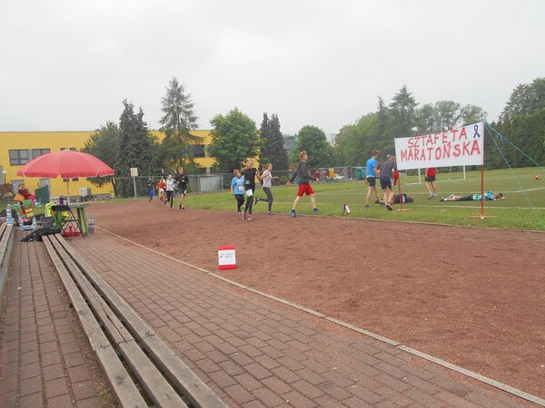 W tym roku zmagania biegowe poprzedzono minutą ciszy dla upamiętnienia górników, którzy zginęli na początku maja w kopalni Zofiówka. O godzinie 8:10, po krótkiej rozgrzewce, uczniowie szkoły podstawowej, klas gimnazjalnych, absolwenci oraz nauczyciele rozpoczęli zmagania z „królewskim dystansem”. Uczestnicy sztafety pokonywali kolejne okrążenia stadionu, pamiętając o uzupełnianiu płynów izotonicznych oraz witamin. Po przebiegnięciu ok. 29 km, pojawiła się realna szansa na poprawienie dotychczasowego rekordu 2h 29’ 49”. Warunkiem było pokonywanie kolejnych „kółek” w tempie co najmniej 3’50” na kilometr. Nikogo nie trzeba było dodatkowo motywować. Kolejne zmiany były bardzo „mocne”. Ostatecznie po 2h 23’ 55” drużyna w składzie: Natalia Bronny, Paulina Frątczak, Natalia Gwiaździńska, Małgorzata Szuścik, Paulina Macharzyńska, Natalia Karwacka, Grzegorz Machnik, Jakub Wieremczuk, Robert Kamiński, Krystian Piątyszek, Bartłomiej Jaszczuk, Paweł Frątczak, Piotr Frątczak, Maria Lerch, Norbert Mosioł, Adrian Mencner minęła linię mety. Po krótkim odpoczynku do wszystkich biegaczy dotarło, że nowy rekord jest o ponad 5 minut lepszy od poprzedniego. Radości nie było końca. Wszyscy wzajemnie gratulowali sobie osiągniętego wyniku. Na koniec odbyła się uroczysta dekoracja piernikowymi medalami i dyplomami. Był słodki poczęstunek i mnóstwo pozytywnej energii, a po zakończeniu zawodów kilku biegaczy po prostu zjadło swoje piernikowe medale.
