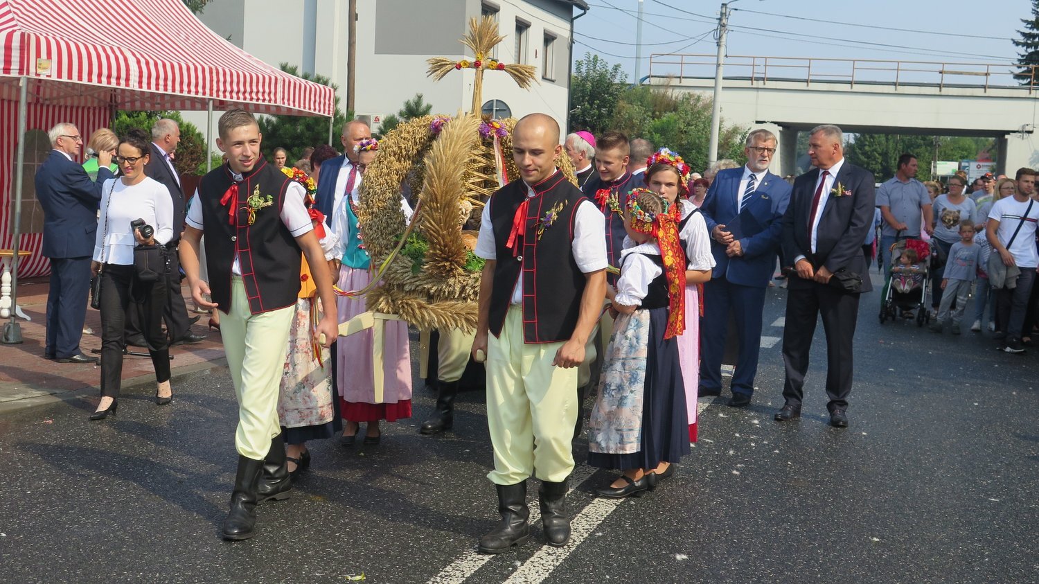 Starostowie Grażyna i Daniel Godźkowie wręczyli chleb wójtowi Franciszkowi Dziendzielowi, gospodarzowi dożynek gminnych, które 2 września odbyły się w Warszowicach.