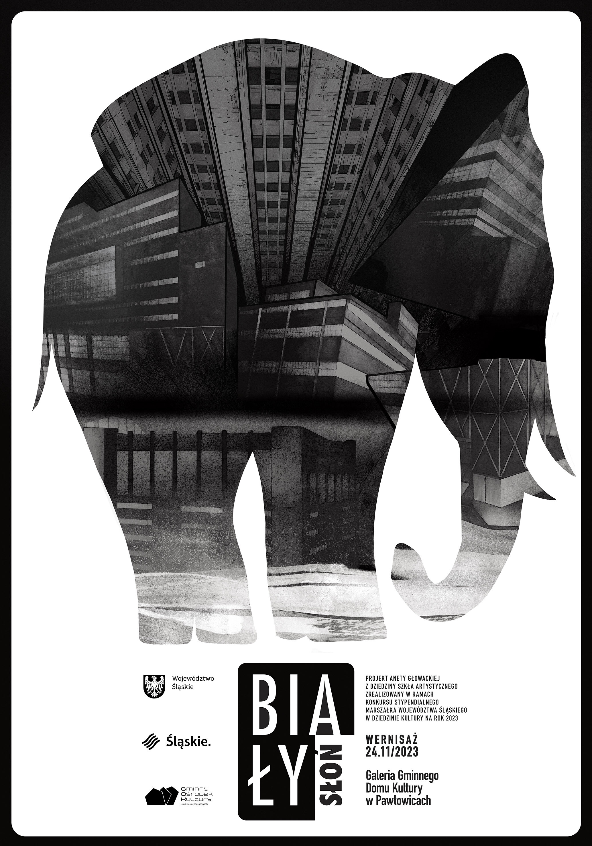 Mamy zaszczyt zaprosić Was na wernisaż pt "BIAŁY SŁOŃ" autorstwa Anety Głowackiej, który odbędzie się 24 listopada 2023, o godz. 17:15. Wystawa jest elementem projektu realizowanego w ramach konkursu stypendialnego Marszałka Województwa Śląskiego w dziedzinie kultury na rok 2023.