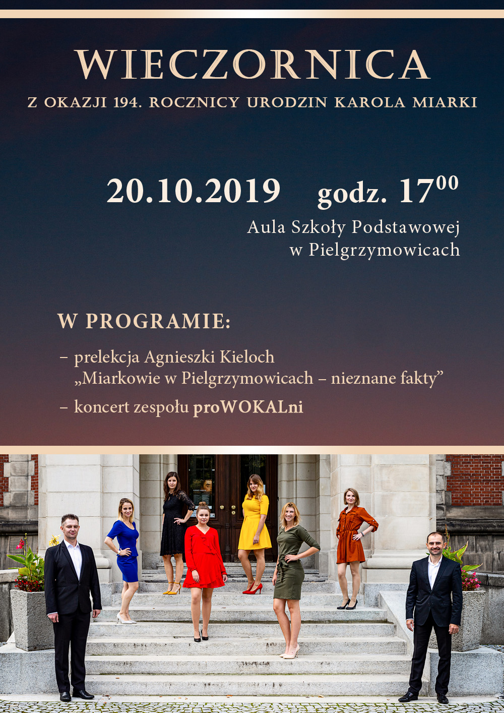 Stowarzyszenie Kulturalno-Społeczne Karola Miarki w Pielgrzymowicach zaprasza na Wieczornicę. Z okazji 194. rocznicy urodzin Karola Miarki, dnia 20 października o godz. 17:00 w Auli Szkoły Podstawowej w Pielgrzymowicach będzie można wysłuchać prelekcji Agnieszki Kieloch pt. "Miarkowie w Pielgrzymowicach - nieznane fakty" oraz koncertu zespołu "proWOKALni". Wstęp jest wolny.