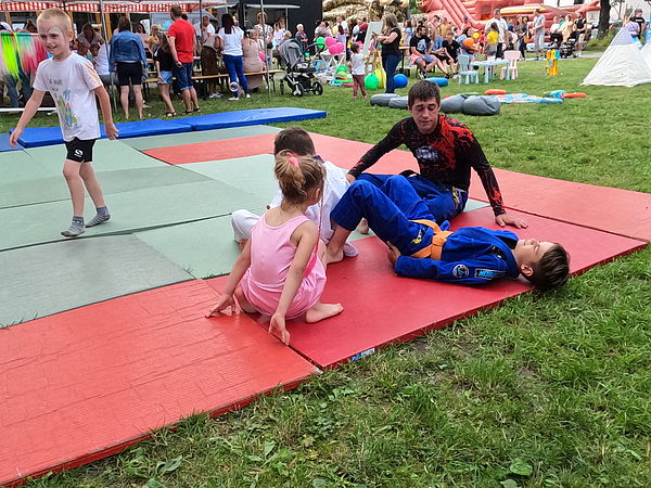 Najmłodszym uczestnikom pikniku wykonywano brokatowe tatuaże, malowano twarze, zaplatano kolorowe warkoczyki. Dzieci miały możliwość m.in. samodzielnego wykonania slimów, skakania na dmuchańcach czy trenowania sztuk walki z UKS Budo. Dzieci mogły również bawić się, głaskać i karmić alpaki i kozę Balbinę, a także spróbować swoich sił w jeździe konnej. Strażacy z OSP w Pawłowicach udostępnili swój wóz bojowy, by każdy chętny mógł obejrzeć jego wyposażenie. Swoje usługi prezentowało również Stowarzyszenie Przyjaciół Zwierząt Dużych i Małych „Cztery Łapy”, Niepubliczna Specjalistyczna Poradnia Psychologiczno- Pedagogiczna „Ala i As” oraz Poradnia Psychologiczno-Pedagogiczna "Ariadna”. Do dyspozycji dzieci i ich rodziców był m.in. psycholog i logopeda.Zainteresowaniem uczestników pikniku cieszył się tzw. mondioring czyli pokaz posłuszeństwa owczarków belgijskich wykonany przez panią Anię (na co dzień pracowniczkę socjalną OPS) i pasjonatów tej dyscypliny sportowej. Prawdziwymi gwiazdami były psy: Metka i Heros. Obecni na miejscu seniorzy również znaleźli coś dla siebie. Na stanowisku wodzisławskiej filii Akademii Humanistyczno-Ekonomicznej z Łodzi absolwenci-masażyści rozmasowywali bolące stawy, Centrum Medyczne Belamed z Pawłowic sprawdzało poziom cukru i ciśnienia krwi, firma SIDLY wyjaśniła zasady działania opaski bezpieczeństwa, a sprzęt medyczny BEMER pobudził krążenie krwi. Dorośli mogli także skorzystać z poradnictwa prawnego Justyny Zapotoczny-Pelak oraz zrobić test w kierunku zaburzeń poznawczych na stoisku firmy Opiekanova Sp. z o.o.Na głodnych i spragnionych czekał chleb na zakwasie z wegańskim smalcem i kiszonym ogórkiem przygotowany przez panią Basię - jedną z pracowniczek OPS oraz pyszne gofry serwowane przez Panie z Koła Gospodyń Wiejskich w Pawłowicach a także woda z sokiem malinowym z saturatora dostarczona przez Wodociągi Pawłowice. Można było też kupić lody, popcorn, watę cukrową i inne przekąski.Ośrodek Pomocy Społecznej dziękuje za współudział: KGW Pawłowice, OSP Pawłowice, Wodociągi Pawłowice, UKS BUDO, Centrum Medyczne Belamed z Pawłowic, Anna Karpińska, Barbara Zamęcka, MD HORSE Diana Gąsiorek, Przemysław Lęga, Grzegorz, Pisarek, Poradnia Psychologiczno- Pedagogiczna „Ariadna”, Dom Dziennego Pobytu „Ariadna”, Niepubliczna Specjalistyczna Poradnia Psychologiczno- Pedagogiczna „Ala i As”, BEMER Group Monika Wicherek, AHE w Łodzi, Filia w Wodzisławiu Śląskim, OPIEKANOVA Sp. z o.o., SIDLY Sp. z o.o., Stowarzyszenie Na Rzecz Poradnictwa Obywatelskiego "DOGMA", Stowarzyszeniem Przyjaciół Zwierząt Dużych i Małych „Cztery Łapy”.Fot. Ośrodek Pomocy Społecznej w Pawłowicach