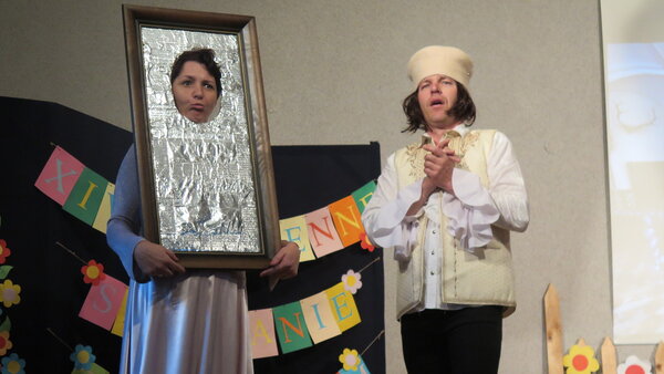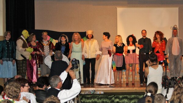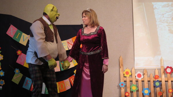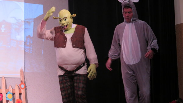 Po przerwie na scenie pojawili się aktorzy – nauczyciele z SP Pielgrzymowice, którzy wcielili się w role postaci z bajki (tym razem współczesnej) – Śląski Shrek. Żywiołowa reakcja widowni pozwala przypuszczać, że chyba wszystkim się podobało.