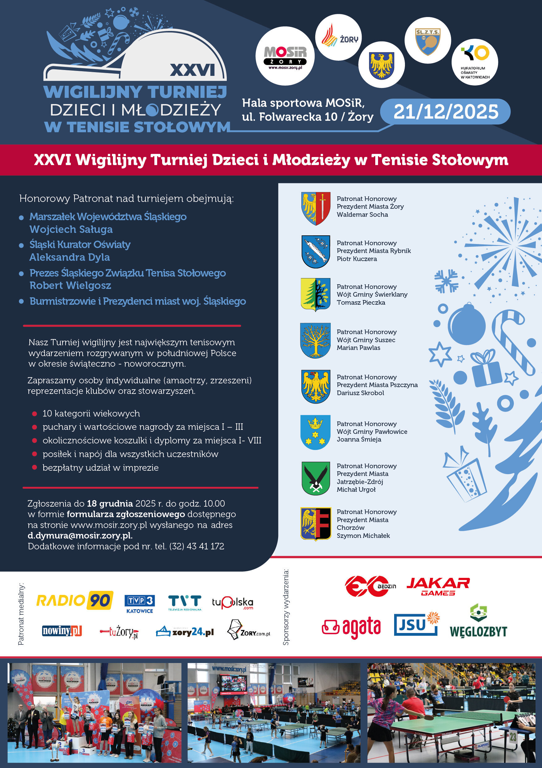 Miejski Ośrodek Sportu i Rekreacji w Żorach serdecznie zaprasza dzieci i młodzież z Gminy Pawłowice do udziału w XXVI Turnieju Wigilijnym w Tenisie Stołowym – największym świąteczno-noworocznym turnieju tenisowym dla najmłodszych w południowej Polsce. Wydarzenie to gromadzi w żorskiej Hali Widowiskowo-Sportowej setki młodych pasjonatów tenisa stołowego.