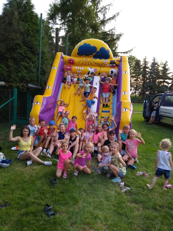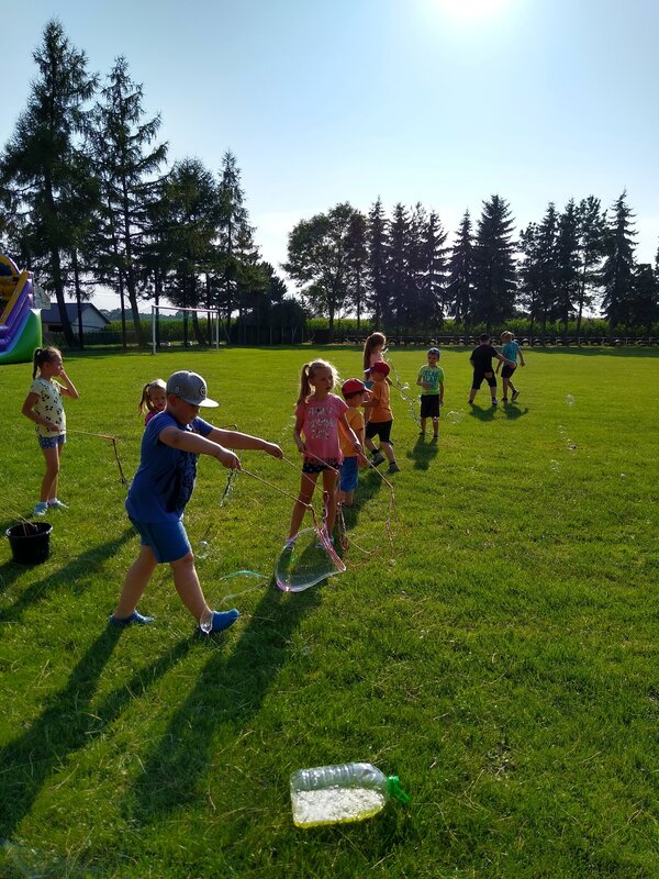 Ostatnie zajęcia odbyły  na boisku MKS w Golasowicach w ostatni poniedziałek lipca. Na uczestników czekały liczne atrakcje, między innymi dmuchaniec, zabawy w grupie oraz poczęstunek. Dzieci nie nudziły się, gdyż mogły zagrać w piłkę, pobawić się chustą animacyjną oraz samodzielnie puszczać duże bańki mydlane. Dodatkowo rodzice wraz z dziećmi rozwiązywali krzyżówkę profilaktyczną. W czasie spotkania każdy mógł poczęstować się kiełbaską ufundowaną przez Radę Sołecką oraz smakołykami ofiarowanymi przez Kwiaciarnię Aga. Biblioteka serdecznie dziękuje opiekunom: Roksanie Kaul oraz Beacie Szewczyk za bezinteresowną pomoc w opiece nad dziećmi w czasie wszystkich spotkań. Zadanie było współfinansowane z budżetu gminy Pawłowice.
