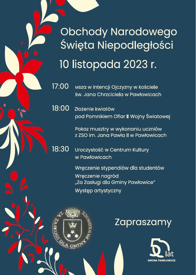 O godzinie 17:00 zapraszamy na mszę w intencji ojczyzny w kościele pw. Narodzenia św. Jana Chrzciciela w Pawłowicach. Około godz.18:00 przy pomniku Ofiar II Wojny Światowej (plac przy Centrum Kultury) wspólnie odśpiewamy hymn Polski, a przedstawiciele samorządu pod pomnikiem złożą kwiaty i zapalą znicze. Uczniowie klas mundurowych z Zespołu Szkół Ogólnokształcących im. Jana Pawła II w Pawłowicach zaprezentują pokaz musztry.