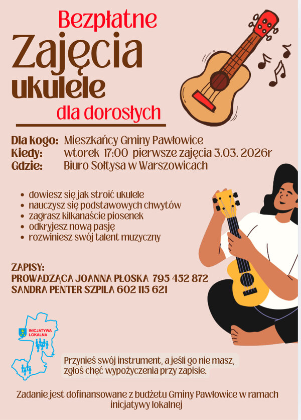 Zapraszamy mieszkańców Gminy Pawłowice na bezpłatne zajęcia nauki gry na ukulele.