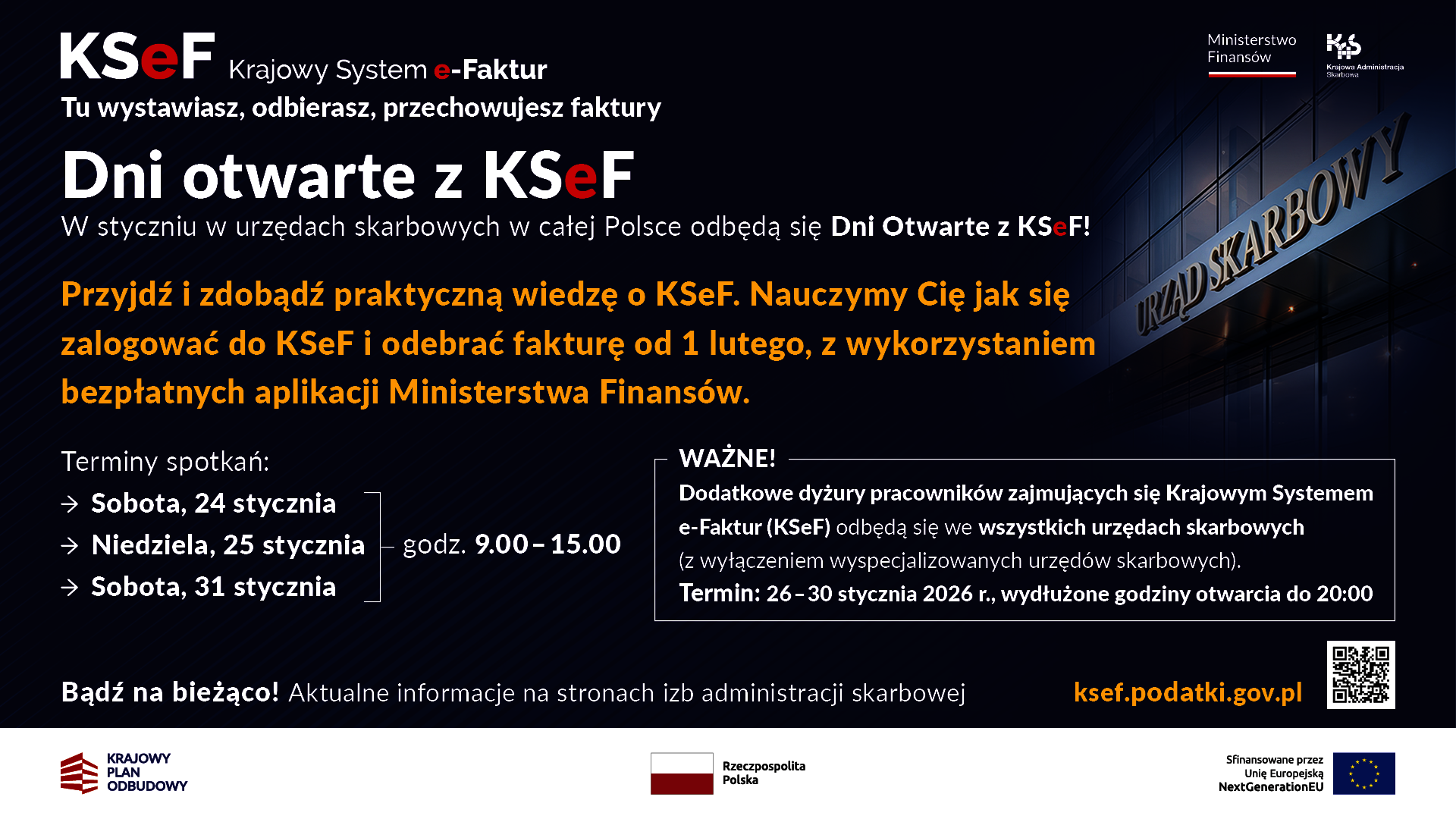 - W weekendowe dni 24, 25 i 31 stycznia 2026 r. w urzędach skarbowych woj. śląskiego (z wyjątkiem wyspecjalizowanych) odbędą się dni otwarte z Krajowym Systemem e-Faktur (KSeF).