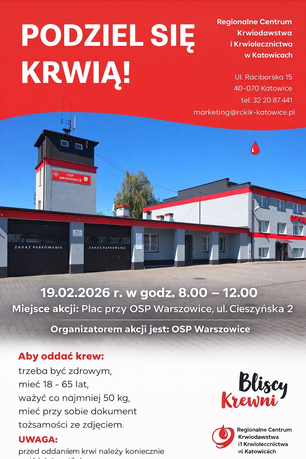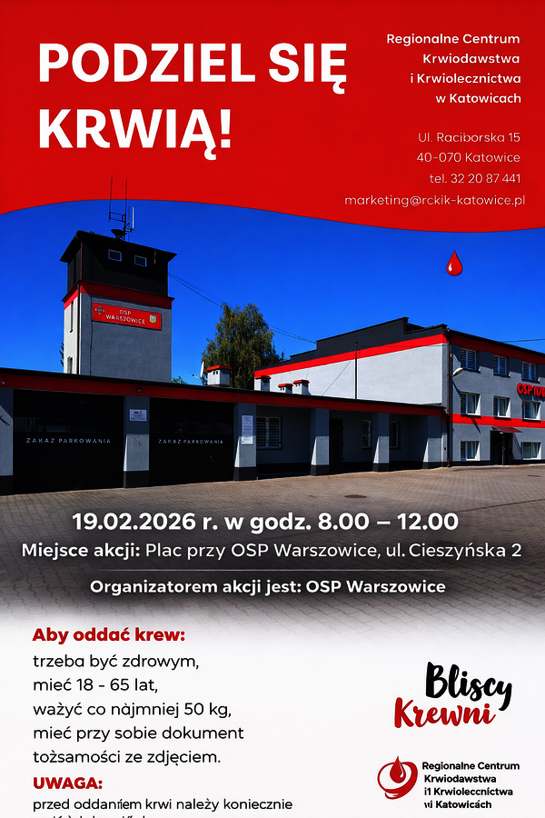 Zapraszamy wszystkich mieszkańców do udziału w akcji honorowego oddawania krwi organizowanej we współpracy z Regionalnym Centrum Krwiodawstwa i Krwiolecznictwa w Katowicach.