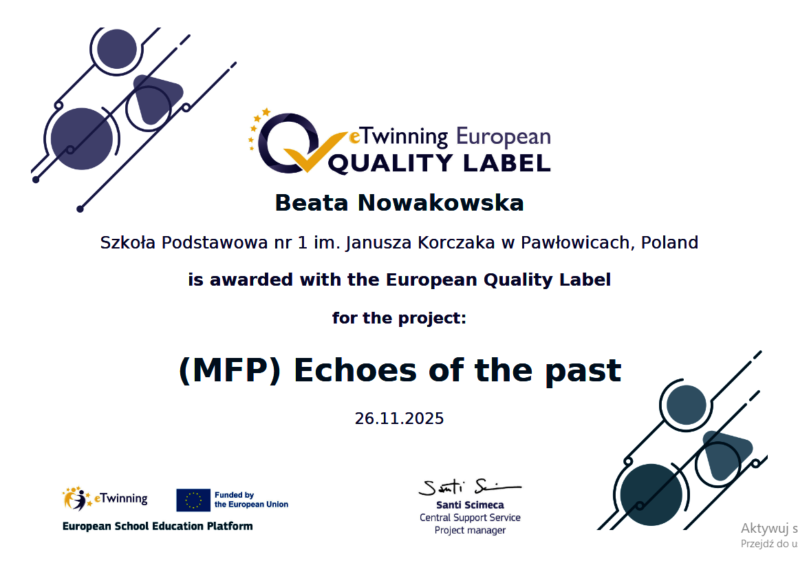 Dla SP1 w Pawłowicach oznacza to, że realizowany przez uczniów i nauczycieli projekt Echoes of the Past („Echa przeszłości”) został oceniony jako szczególnie wartościowy — doceniono zaangażowanie uczestników, jakość współpracy oraz rezultaty działań.