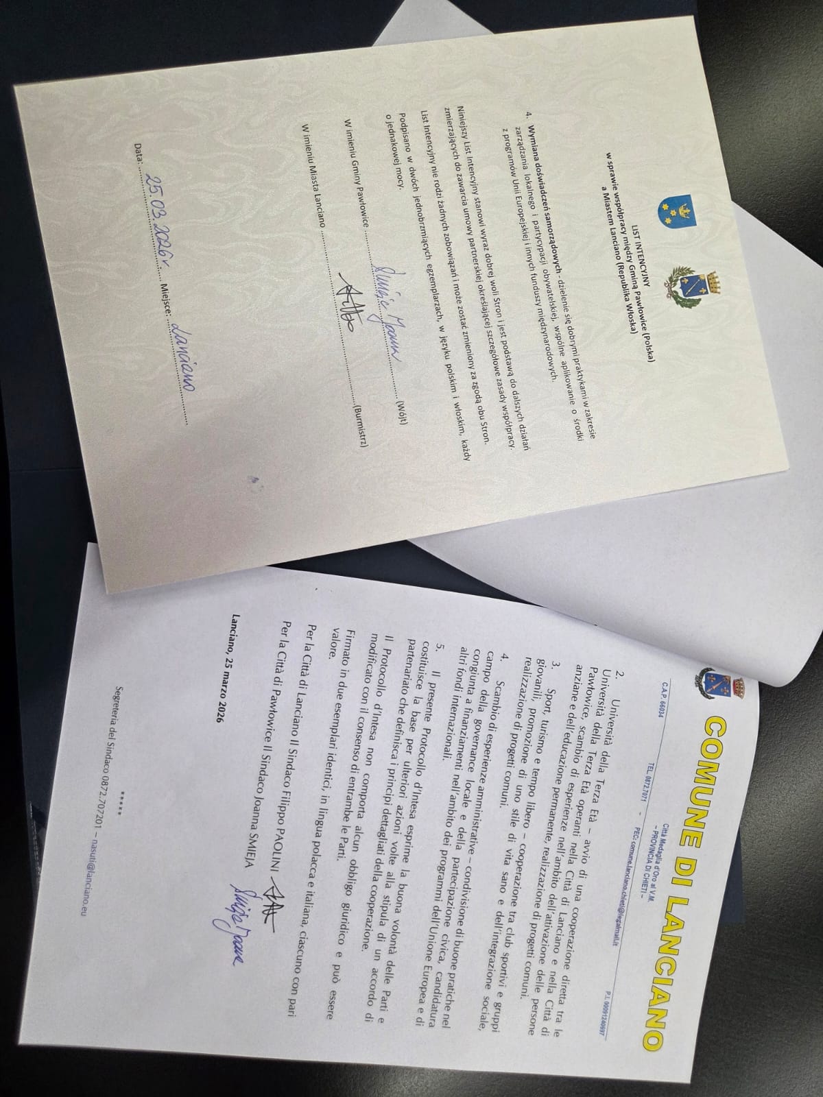 Pawłowicki GOK, pod egidą którego działa Uniwersytet Trzeciego Wieku, nawiązał kontakt z analogiczną instytucją w Lanciano - Uniwersytetem V. Bellisario, którego rektorem jest Valeria Cavacini i to właśnie ona wygłosiła referat podczas uroczystości w ratuszu.Co ciekawe, grupa uczniów z pawłowickiej szkoły wraz z nauczycielami przebywa w Lanciano już od soboty 21 marca w związku z realizacją projektu edukacyjnego. Dlatego w spotkaniu w ratuszu uczestniczyli również uczniowie ze szkół w Pawłowicach i Lanciano.