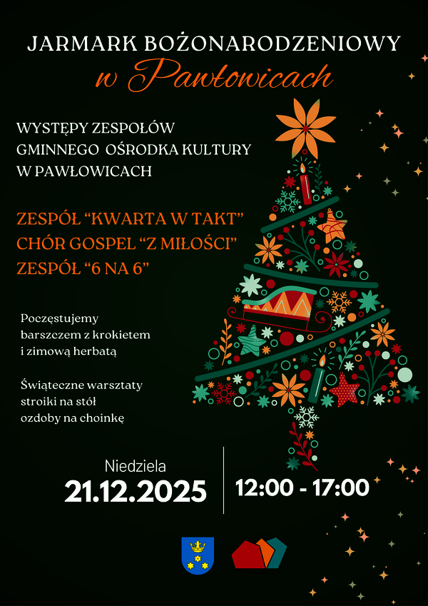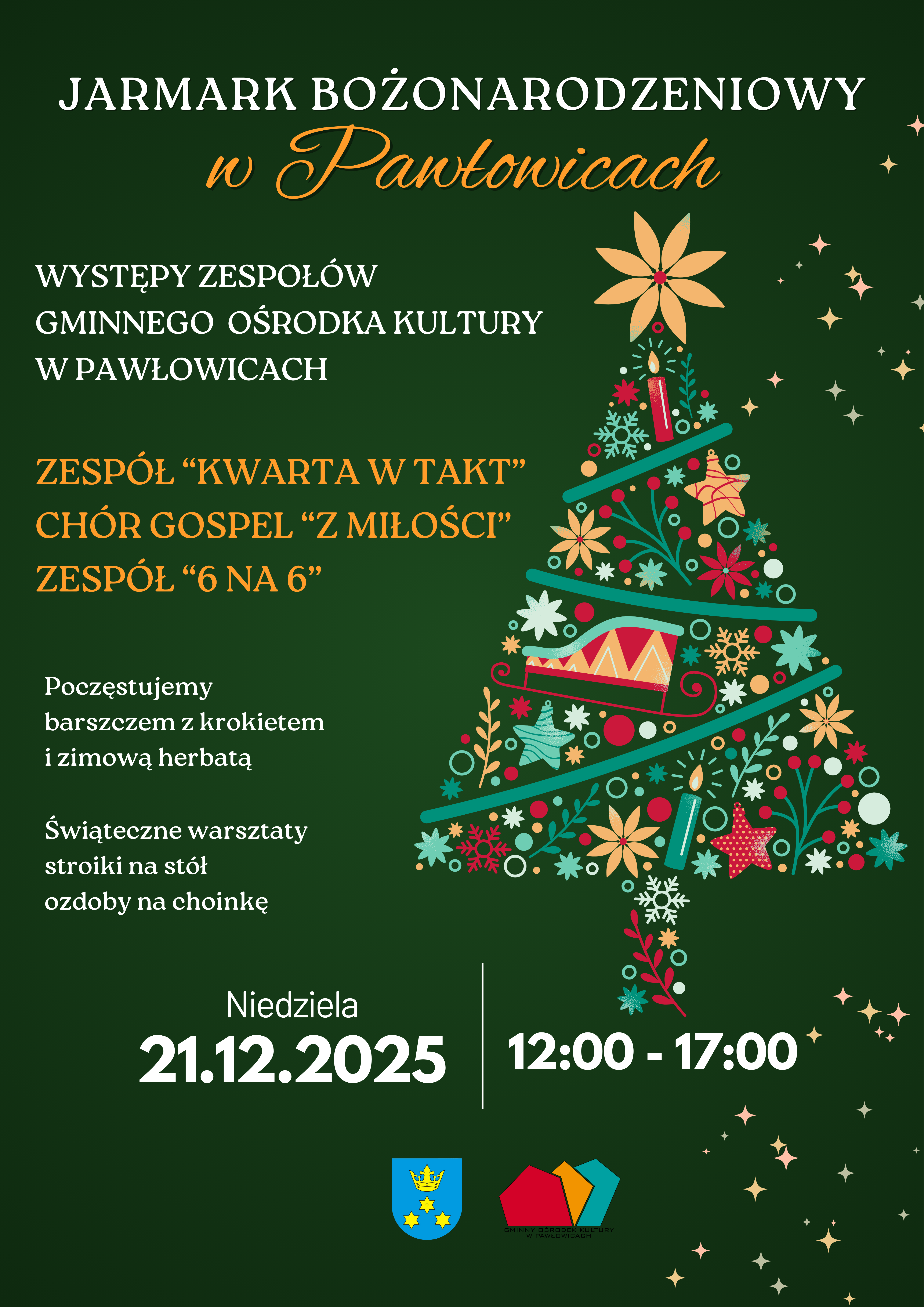 Zapraszamy na Jarmark Bożonarodzeniowy, który odbędzie się 21 grudnia 2025 roku na rynku w Pawłowicach. W tym roku nasze wydarzenie będzie miało koncertowy charakter!