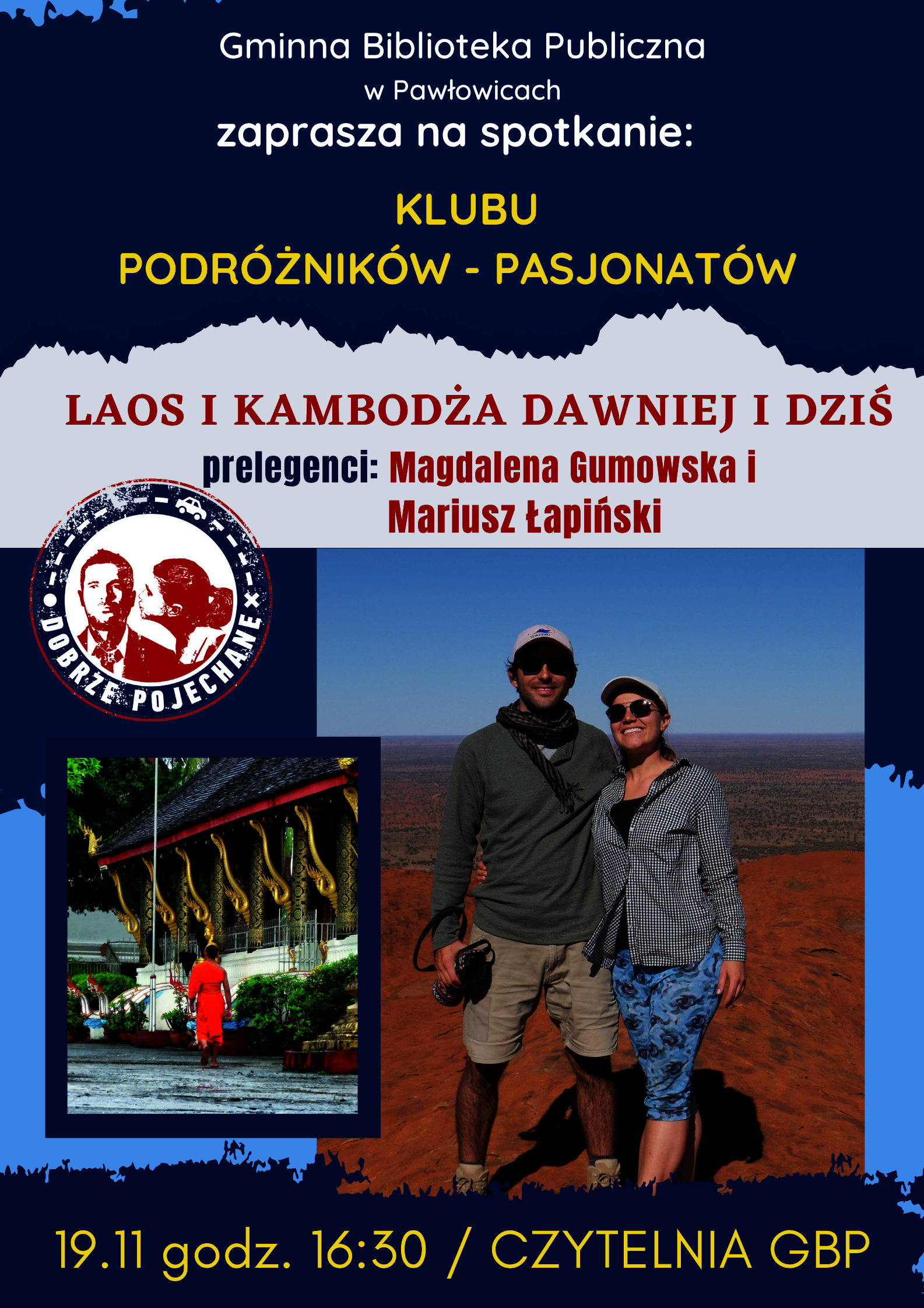 Podczas spotkania 19 listopada zabiorą Państwa do "Laosu i Kambodży dawniej i dziś". Serdecznie zapraszamy o godz. 16:30 do czytelni GBP.