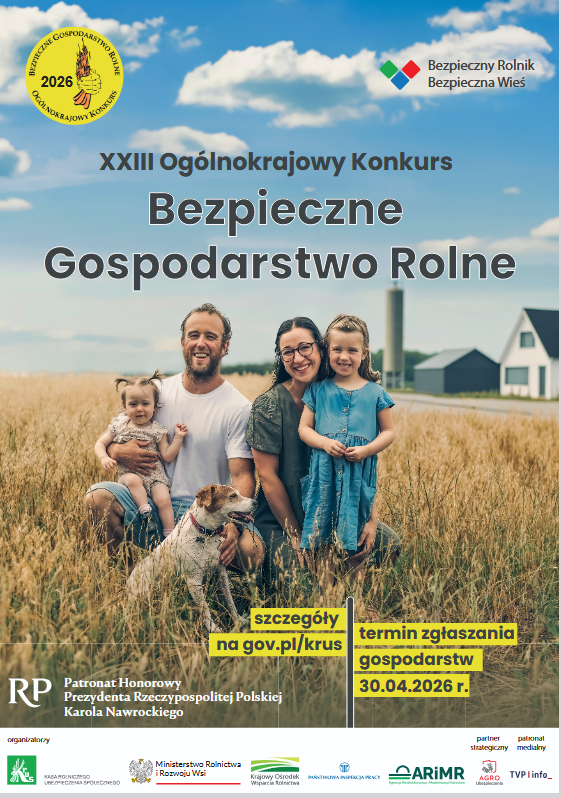 Kasa Rolniczego Ubezpieczenia Społecznego zaprasza właścicieli gospodarstw rolnych, małych jak i dużych, do wzięcia udziału w XXIII Edycji Ogólnokrajowego Konkursu „Bezpieczne Gospodarstwo Rolne”. Patronat honorowy nad Konkursem objął Prezydent RP Karol Nawrocki.