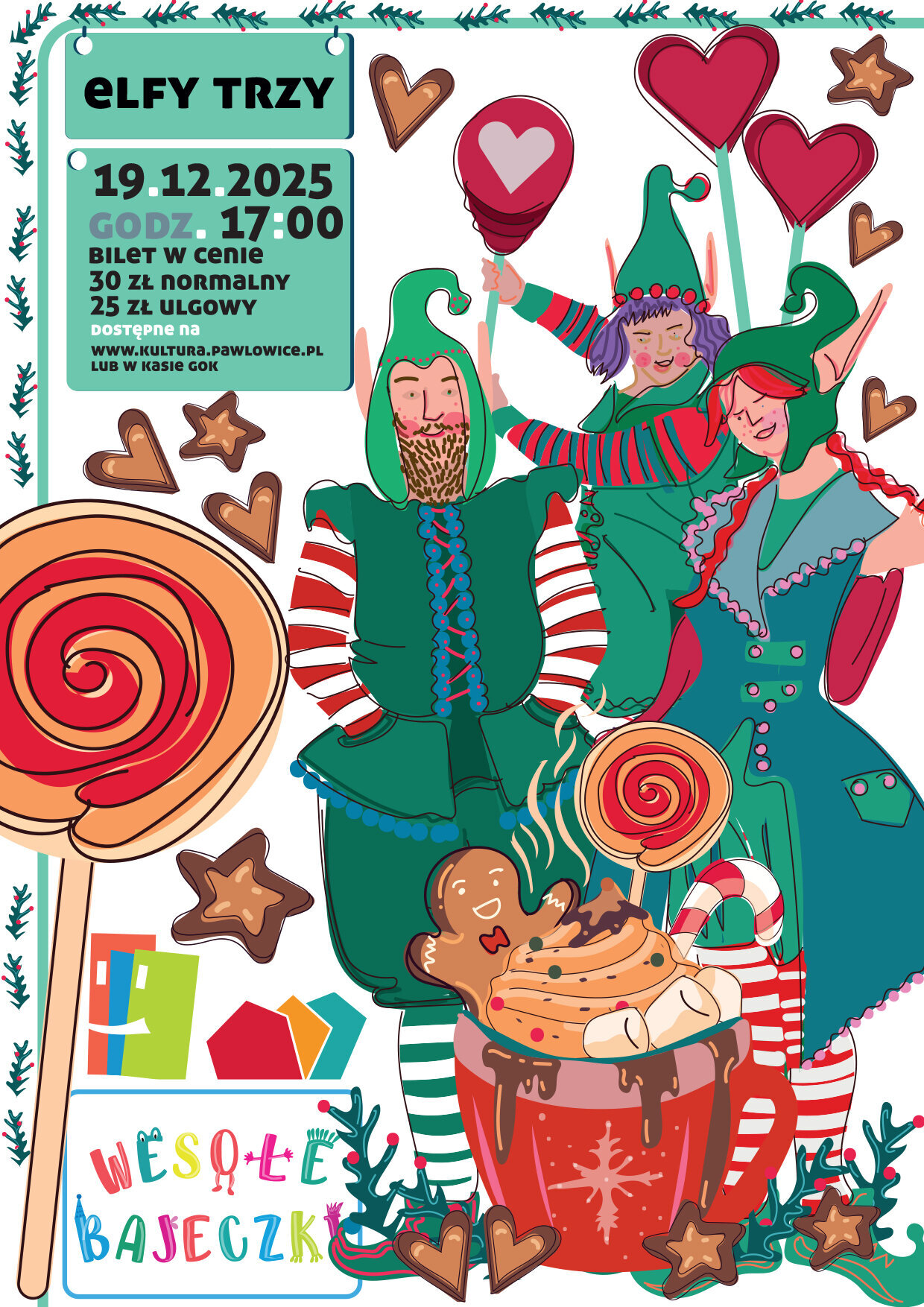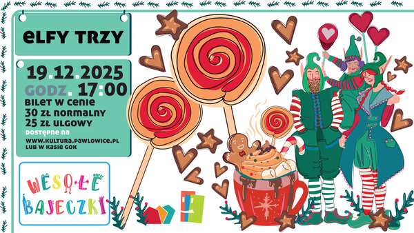 To musical o świątecznej tematyce w wykonaniu Teatru Kultureska, oparty na autorskim scenariuszu. Przeniesie młodego widza na rozśpiewany i roztańczony biegun północny, dzięki bajkowej świątecznej scenografii i kostiumom. Zachwyci go autorską świąteczną muzyką i wyjątkowymi efektami scenicznymi. Historia trzech elfów pełna jest żartów, komicznych scen, dobrego humoru, ale i... zwrotów akcji. Zawiera wychowawczy morał. Dzieci dowiedzą się, dlaczego warto uczyć się na własnych błędach i wyciągać właściwe wnioski ze swojego zachowania.